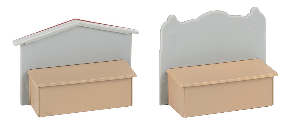 Zwei liebevoll gestaltete Miniatur-Holzbuden stehen