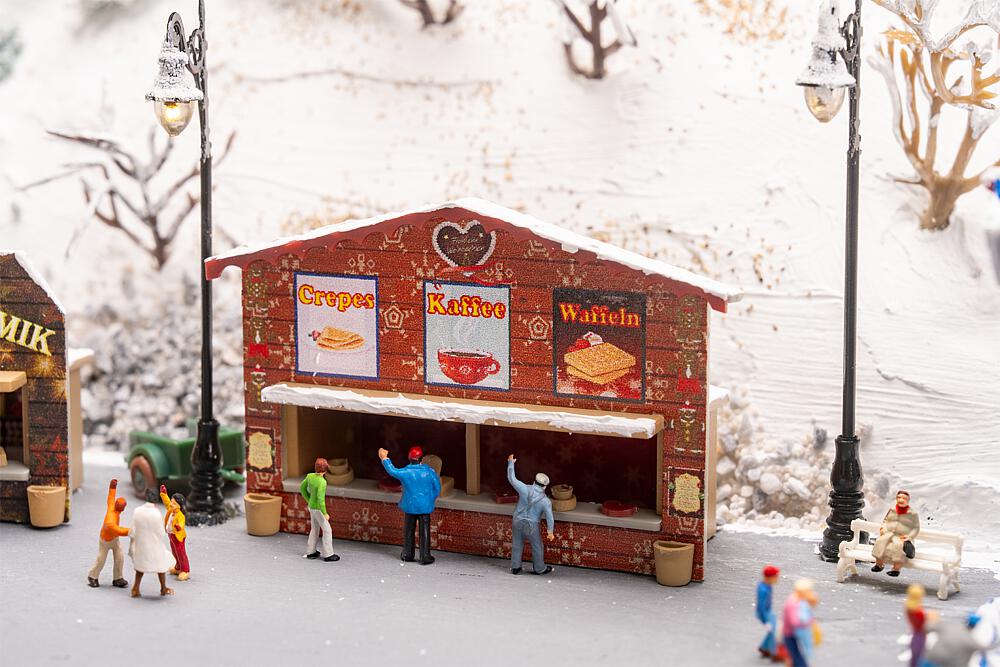 Zwei liebevoll gestaltete Miniatur-Holzbuden laden zum