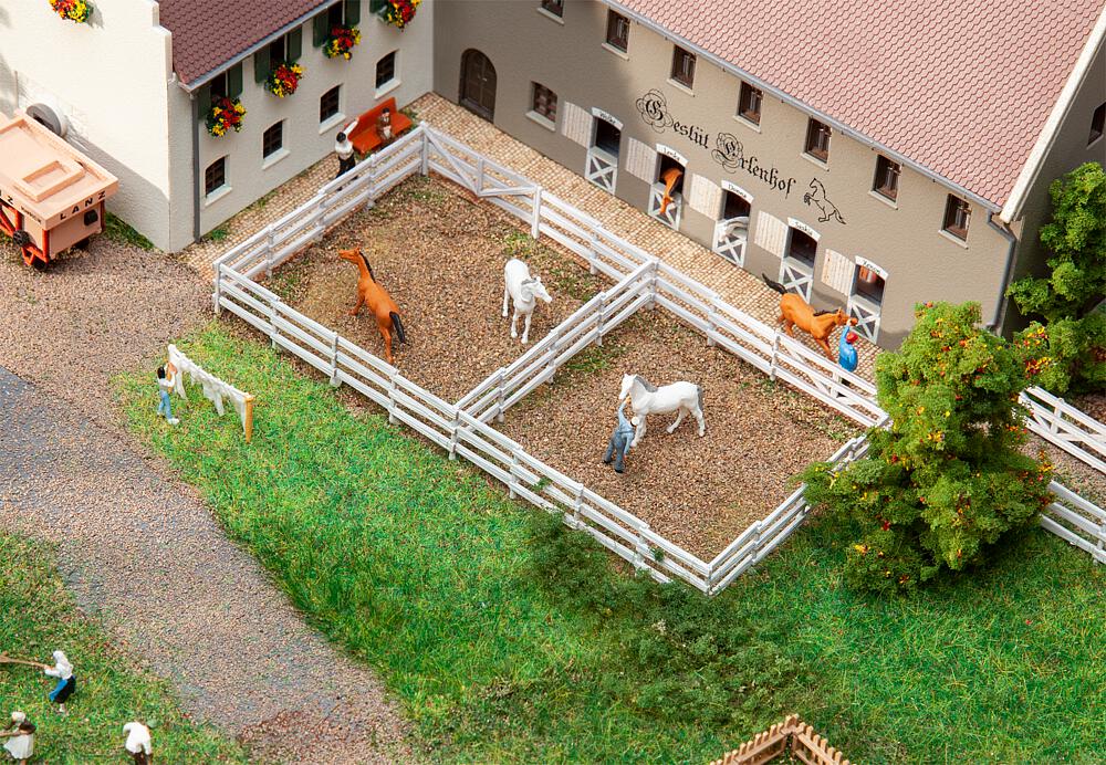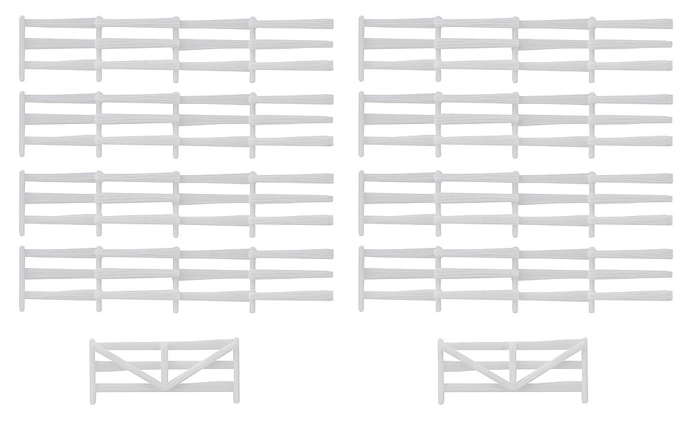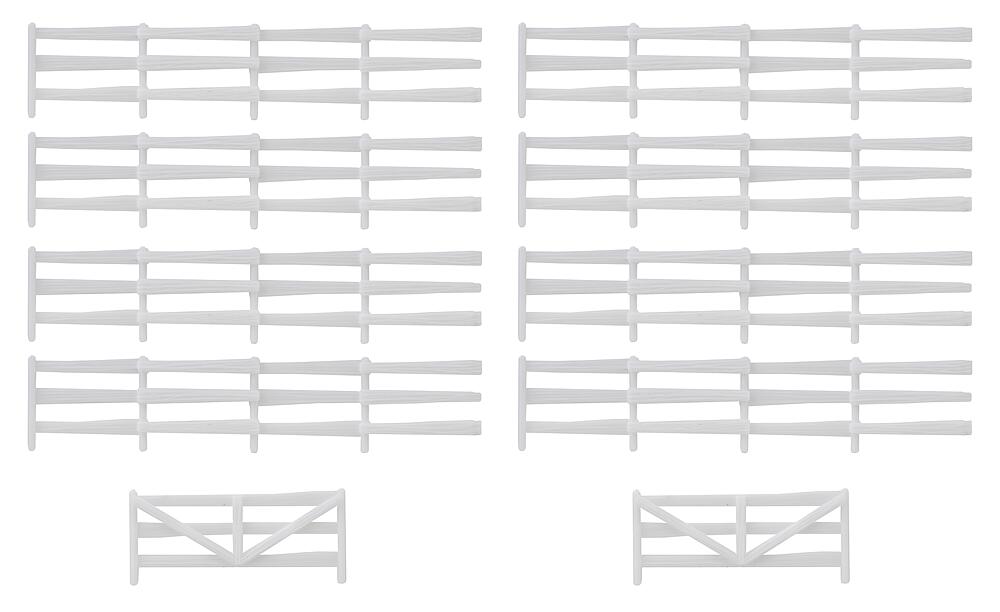 Koppelzaun und Koppeltore, bestehend aus Pfosten, die durch drei Querriegel miteinander verbunden sind. Passend zum Modell »Gestüt Erlenhof«, Art. 232398.