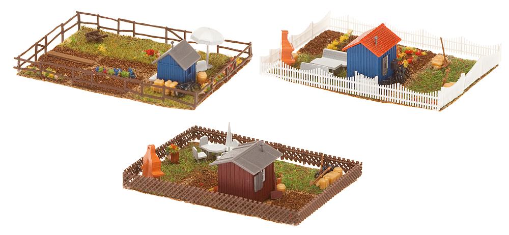 Set mit 3 verschiedenen Schrebergärten mit Gartenhäuschen, jeweils separat umzäunt. Zur Ausstattung gehören Tische und Stühle, Sonnenschirme, Gartengrills, Kisten und Säcke, Gartenwerkzeug und Fahrräder sowie unterschiedlich bepflanzte Landschaftssegmente. Dieser Bausatz enthält: 159 Einzelteile in 10 Farben, Fensterfolie und 1 Bauanleitung.