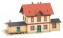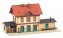 Zweigeschossiges Empfangsgebäude mit grobem Fassadenputz, Stockwerkgesims und einer Holzverschalung im Dach- und Obergeschoss. Ein Güterschuppen mit umlaufender Rampe und ein Fahrradunterstand ergänzen als seitliche Anbauten die Station.
