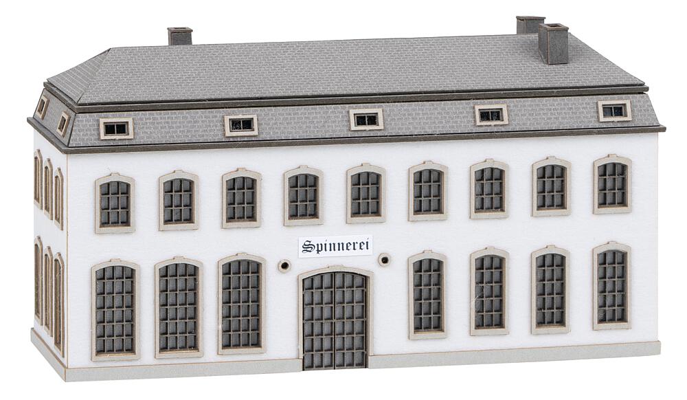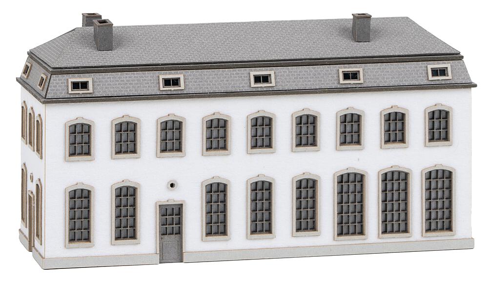 Lasercut-Modell eines hell verputzten Fabrikgebäudes mit einschiffig angelegter Produktionshalle, hohen Sprossenfenstern und gemauerten Fensterrahmungen.