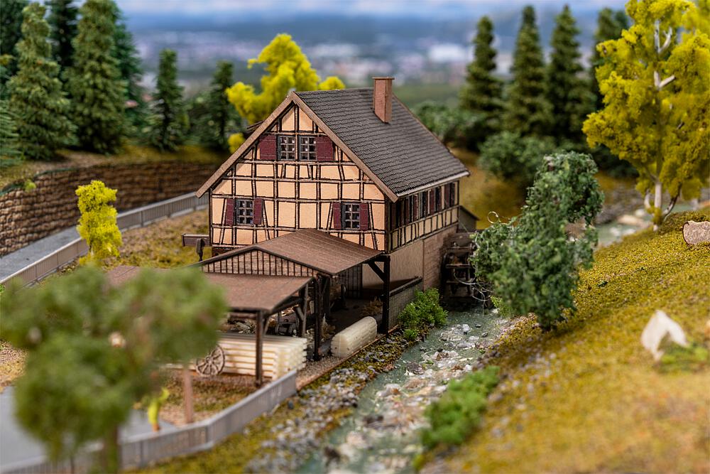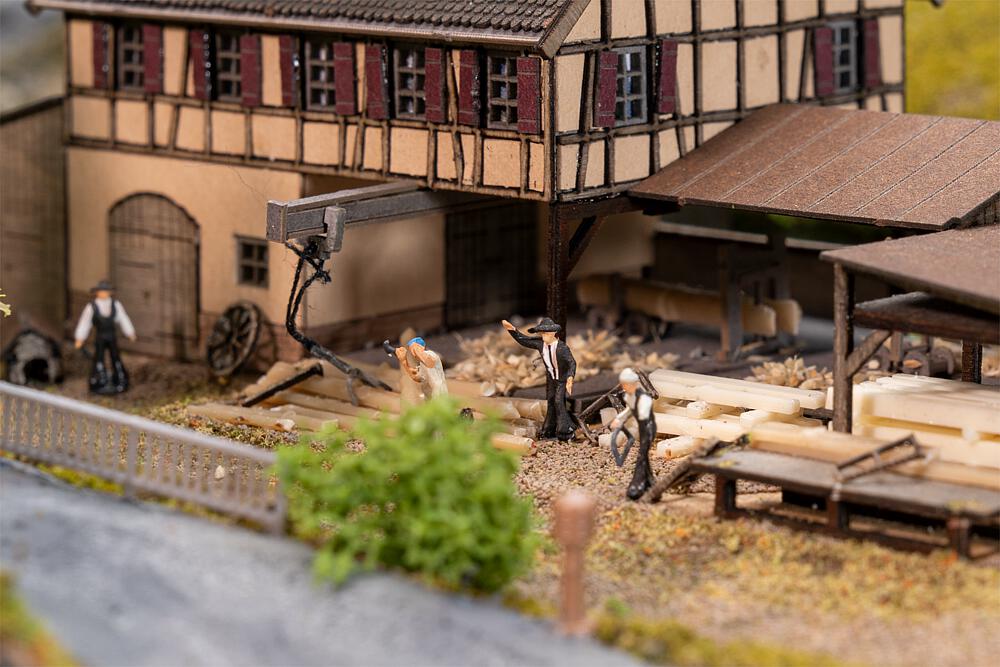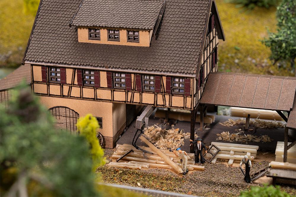 Der Geruch von frisch geschnittenem Holz und Sägespänen, das kräftige Rauschen eines Baches zusammen mit dem gleichmäßigen Klappern des Wasserrads ziehen über die alte Sägemühle mit ihren liebevollen Fachwerkelementen und roten Fensterläden hinweg. Eine kleine Hundehütte und allerlei Holzelemente vervollständigen das Miniaturmodell und fast kann man sich die fleißigen Miniatur-Arbeiter bei der Arbeit vorstellen. Eine perfekte Gelegenheit, um der Modellbauanlage etwas historisches Detail einzuhauchen.