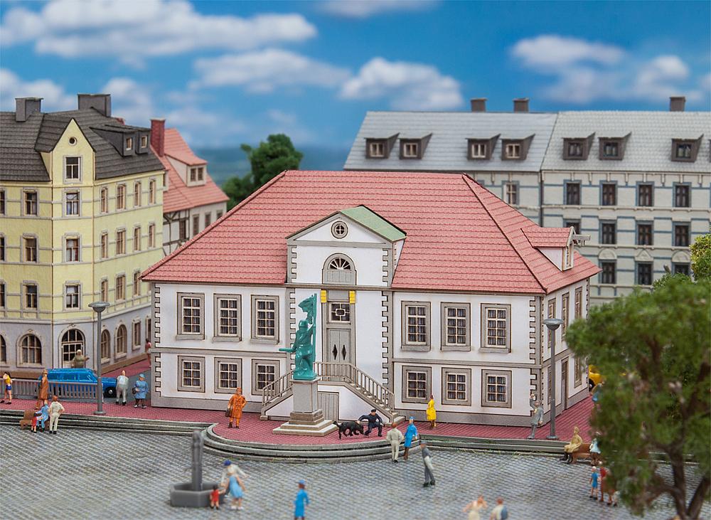 Rapid Manufacturing. Originalgetreues Lasercut-Modell zum 200-jährigen Bestehen des klassizistischen Rathausgebäudes im niedersächsischen »Quakenbrück« mit zweiläufiger Freitreppe, Risalit und Zwerchhaus. Die im Digitaldruck aufgebrachten Gesimse, Ecksteine, Fenster- und Türgewände des zweistöckigen Verwaltungsbaus kontrastieren mit der weißen Fassade. 3D-Druck-Figur und Sockel des aufgestellten Kriegerdenkmals sind im Bausatzumfang enthalten.