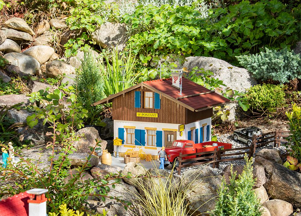 Ländliches Gebäudemodell mit heller Putzfassade, Holzverschalung im Dachgeschoss und einem rückseitigen Balkon. Im Erdgeschoss befindet sich eine kleine Postfiliale. Posttypische Ausgestaltungselemente, wie die Außenbeschilderung, ein Briefkasten mit Standfuß, ein Dienstfahrrad sowie eine Bodenplatte liegen dem Modell bei.