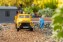 Fahrzeugmodell eines gelben Opel Blitz Abschleppwagens der 50er Jahre. Das Fahrzeug ist mit einem markanten Kranaufbau mit Seilwinde am Heck ausgestattet, der für das Abschleppen von Fahrzeugen verwendet wird. Weitere Details sind die Beschriftungen des Abschleppdienstes »Büttner ? TAG & NACHT« und ein gelbes Warnlicht auf dem Fahrzeugdach. Zudem sind die Motorhaube, Türen und Räder beweglich und machen das Modell noch authentischer.