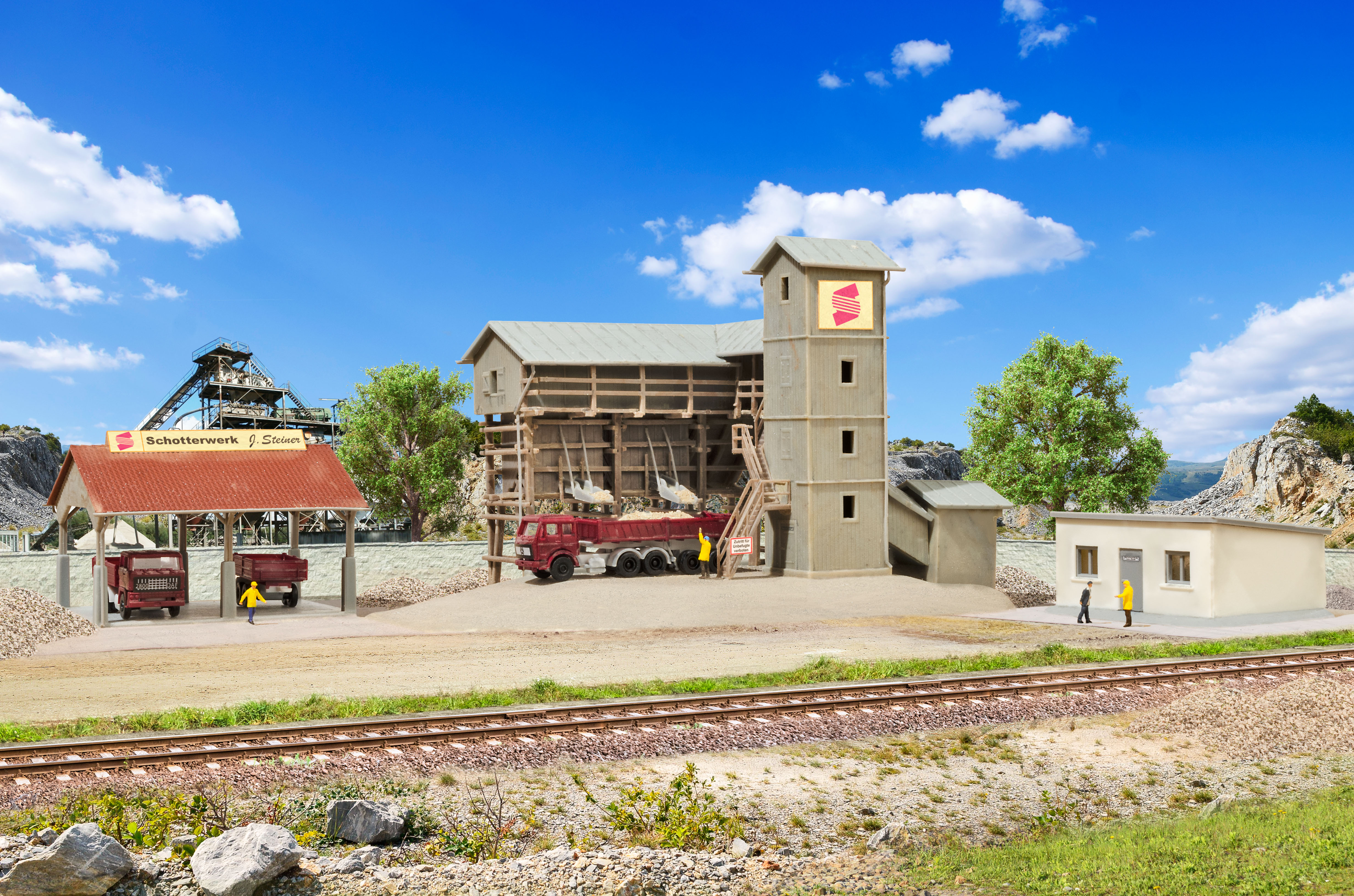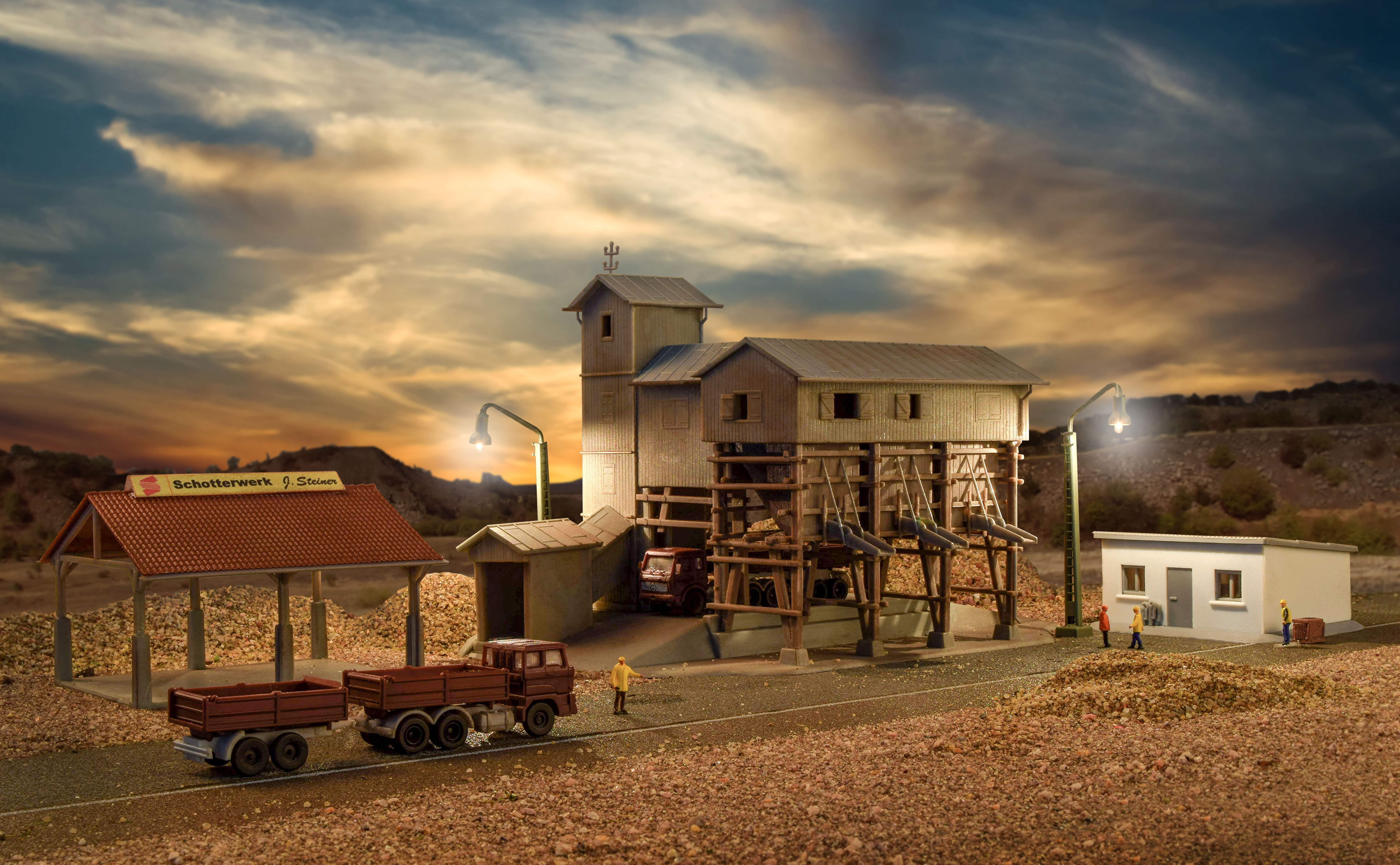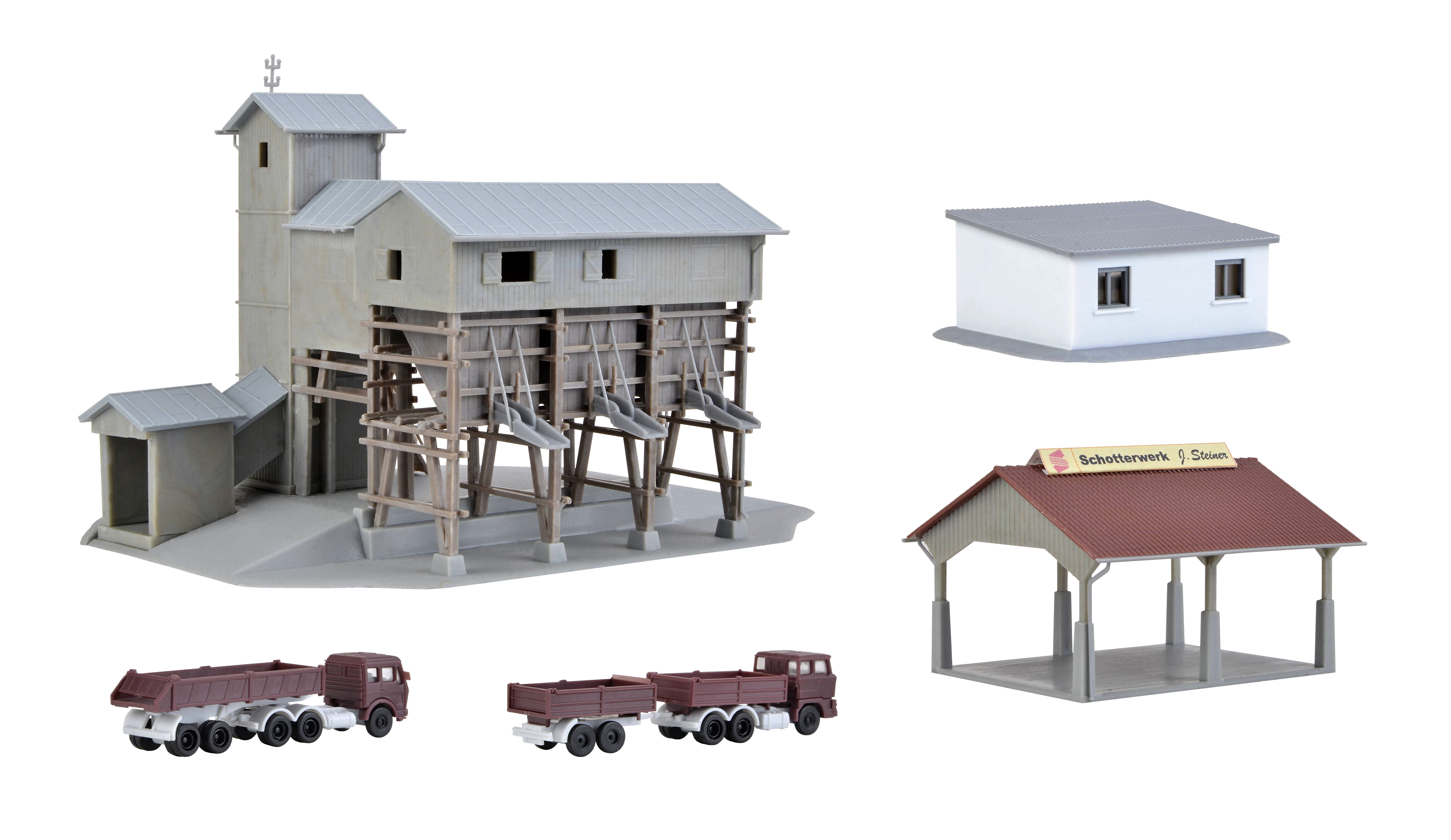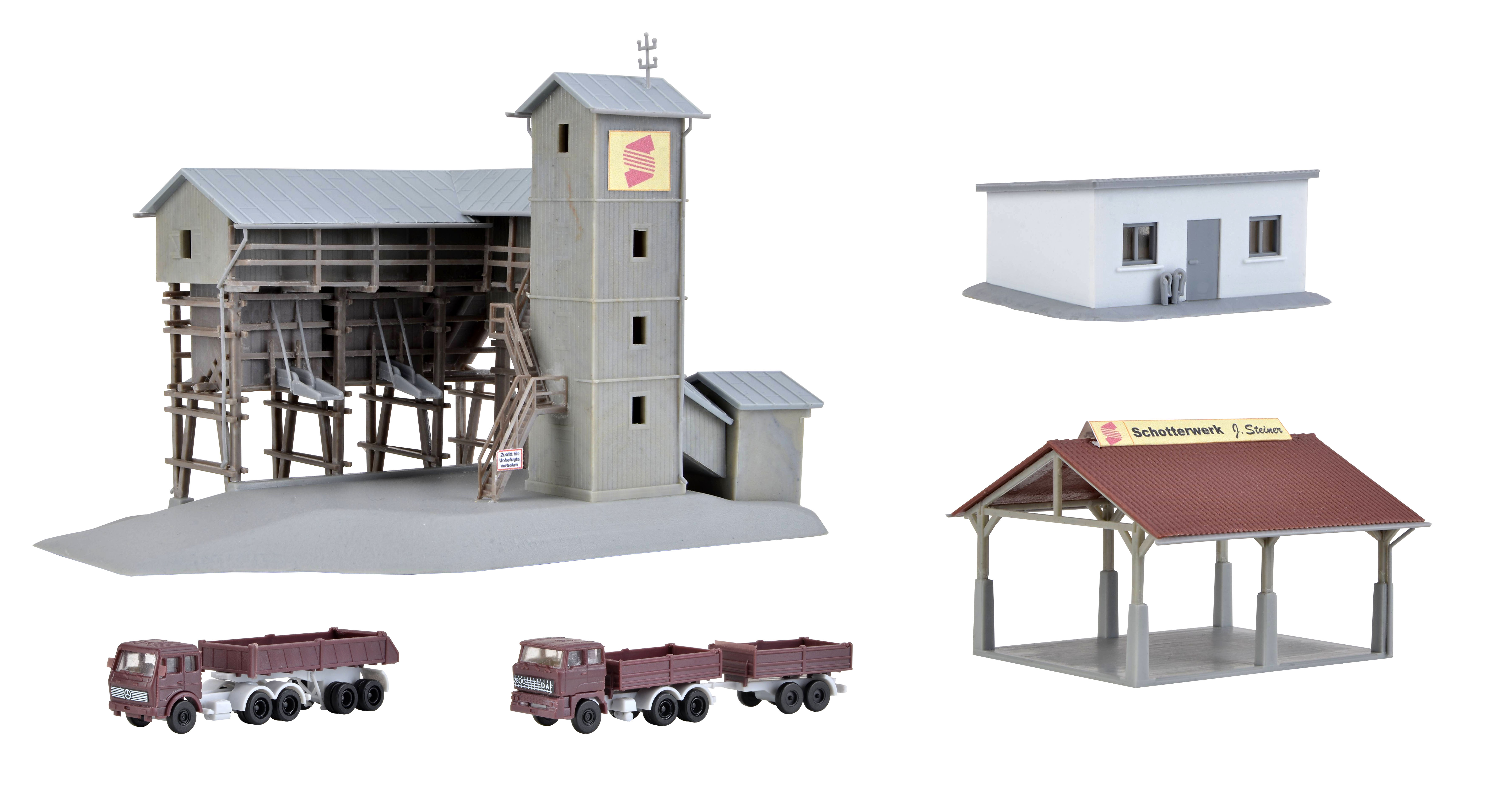 Bausatz. Zu diesem Set gehören das Schotterwerk, 2 LKW, ein Bürogebäude und ein überdachter Lagerplatz. Maße: L 12 x B 8 x H 8,7 cm. LKW DAF: L5,8 x B 1,1 x H 1,3 cm. LKW MB: L 5,2 x B 1,3 x H 1,3 cm. Bürogebäude: L 5 x B 4,5 x H 2,1 cm. Lagerplatz: L 5,4 x B 5,4 x H 3,5 cm. Schwierigkeitsgrad: 2 (Fortgeschrittene).