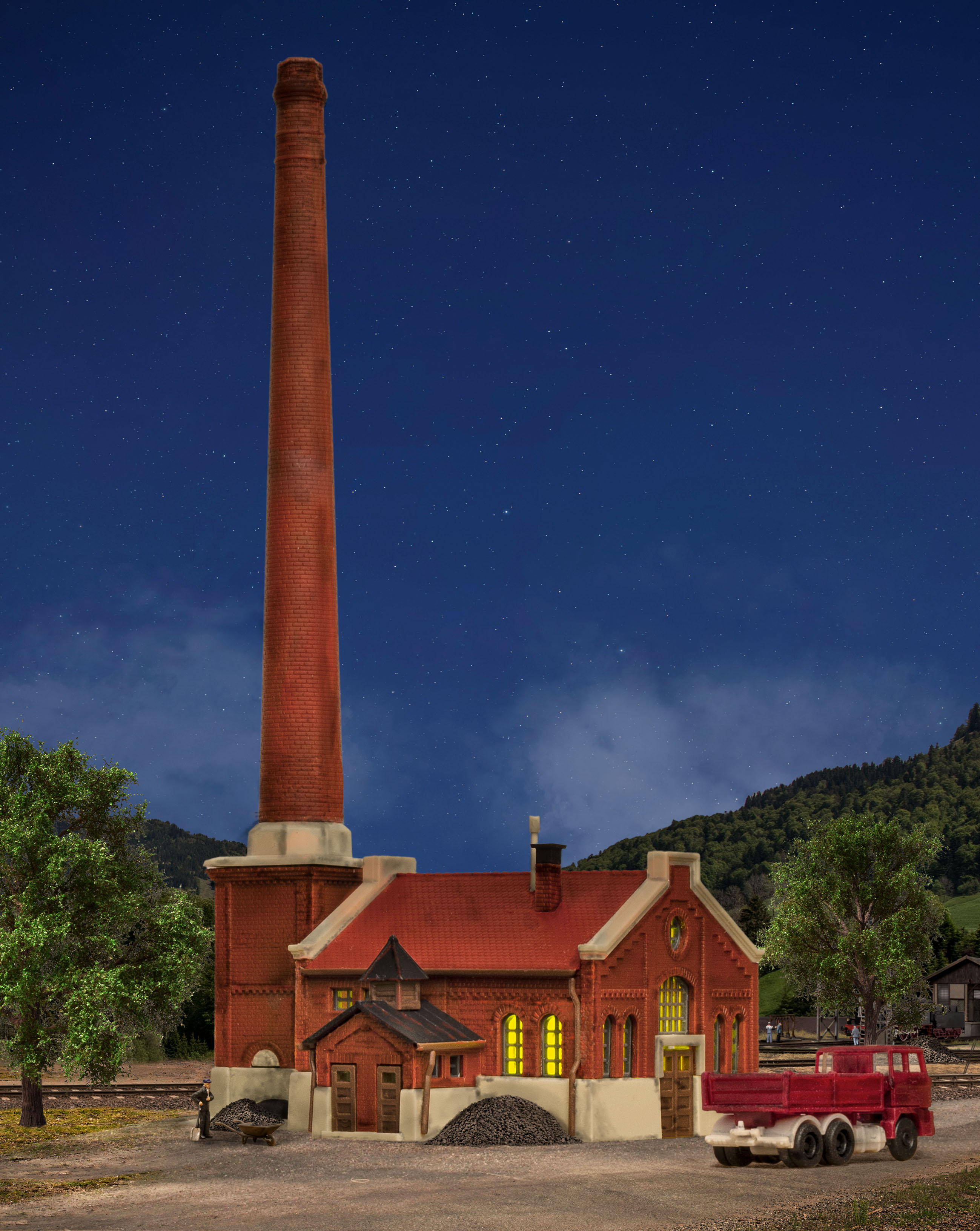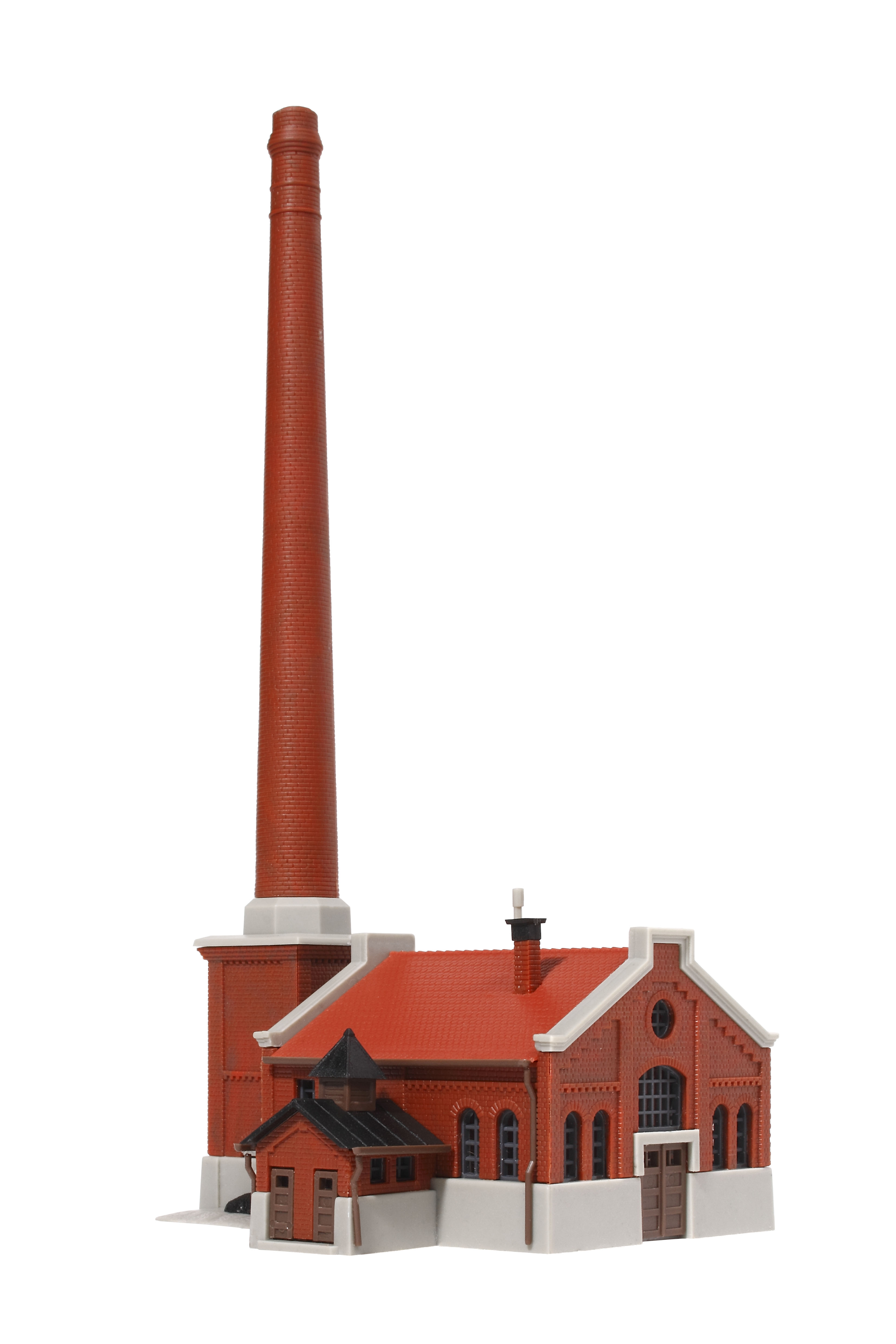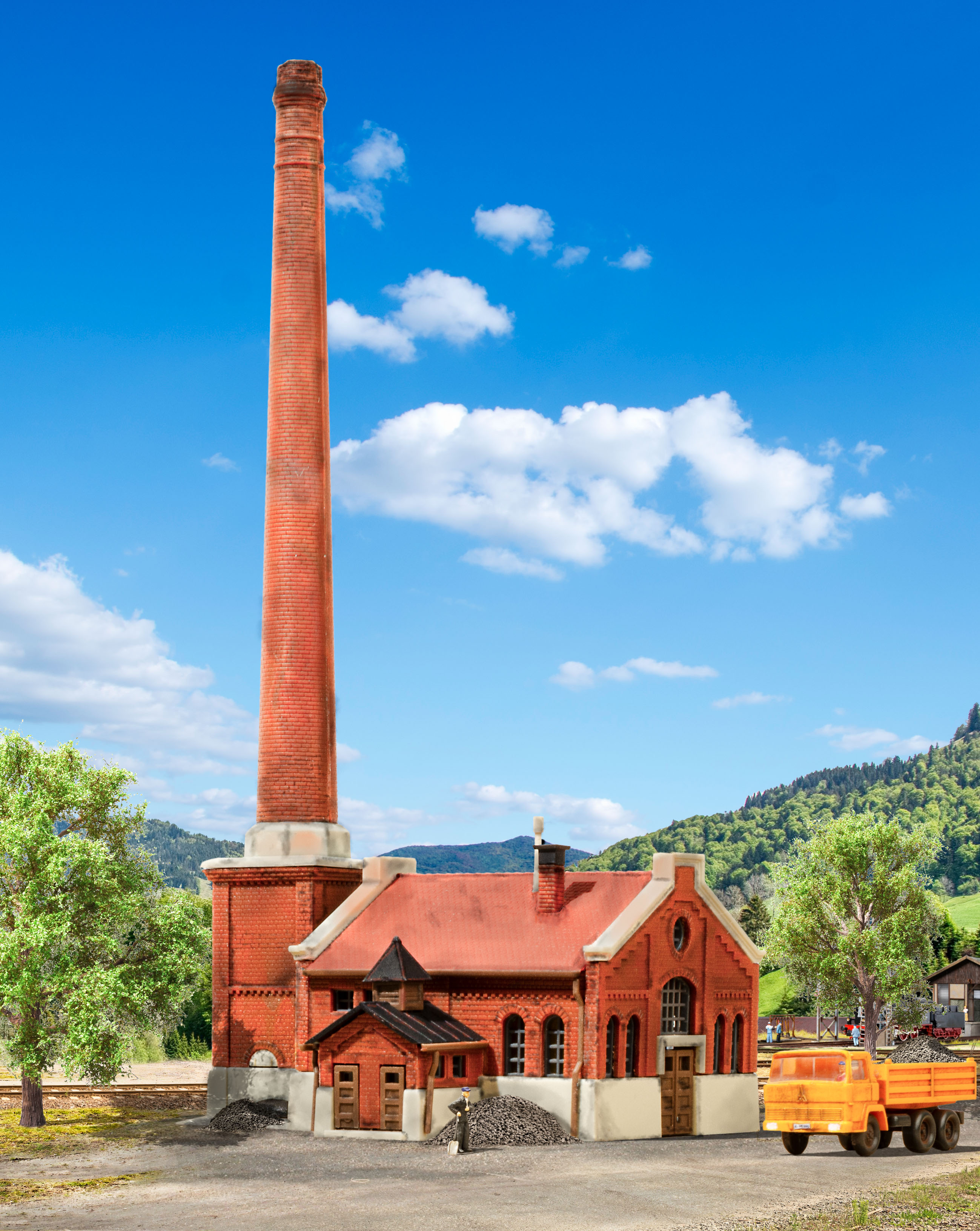 Bausatz. Was wäre ein Fabrikanlage um 1900 ohne typisches Kesselhaus und einen alles überragenden Schornstein? Dieses Industriegebäude bildet einen markanten Blickfang auf Ihrer Anlage. Maße: L 7,3 x B 6,1 x H 15 cm. Schwierigkeitsgrad: 2 (Fortgeschrittene).