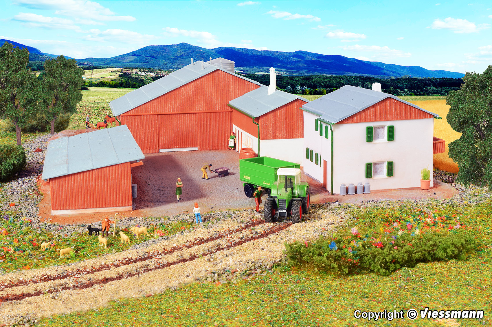 Bausatz. Mit Hauptgebäude, einem 4-ständigen, überdachten Unterstand für die landwirtschalftlichen Maschinen und Fahrzeuge und einem großen Stall. Maße: L 26,5 x B 20,5 x 6 cm. Schwierigkeitsgrad: 2 (Fortgeschrittene).