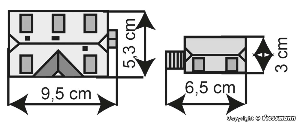 Funktionsbausatz. Die passende LED-Beleuchtung für ein Fenster liegt dem Bausatz bei. Maße: Hauptgebäude L 9,5 x B 5,3 x H 8 cm, Nebengebäude L 6,5 x B 3 x H 4 cm. Schwierigkeitsgrad: 2 (Fortgeschrittene).