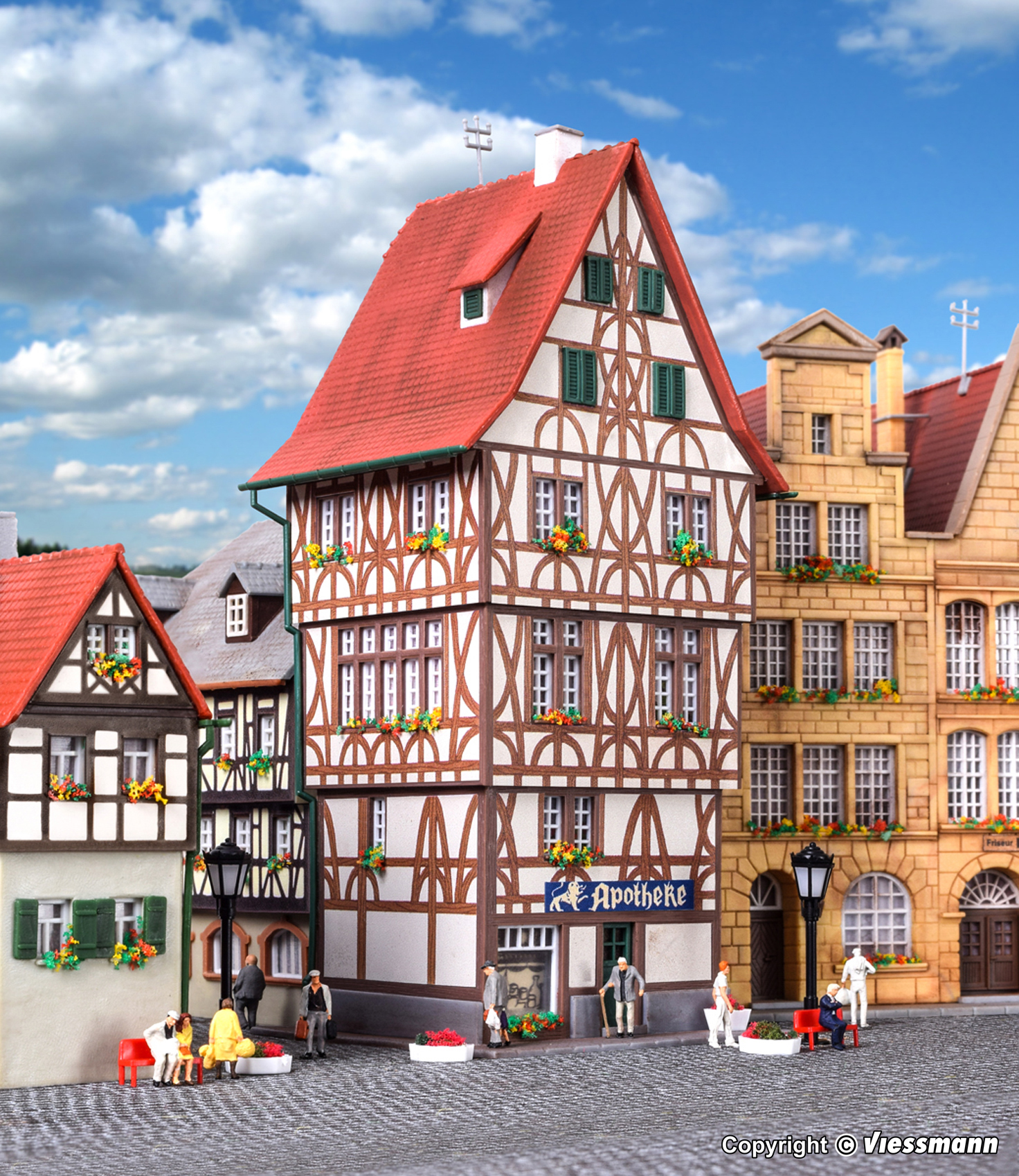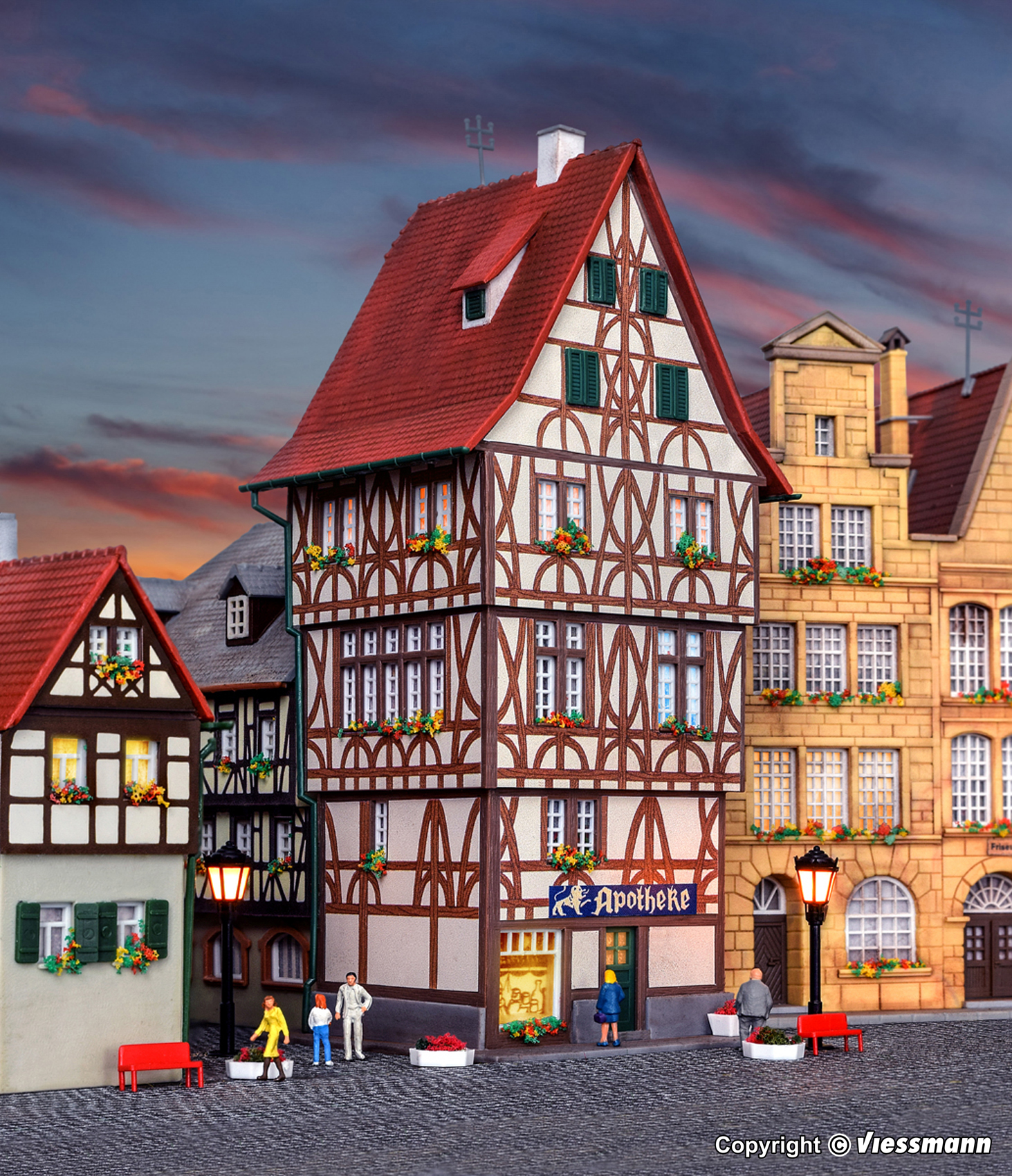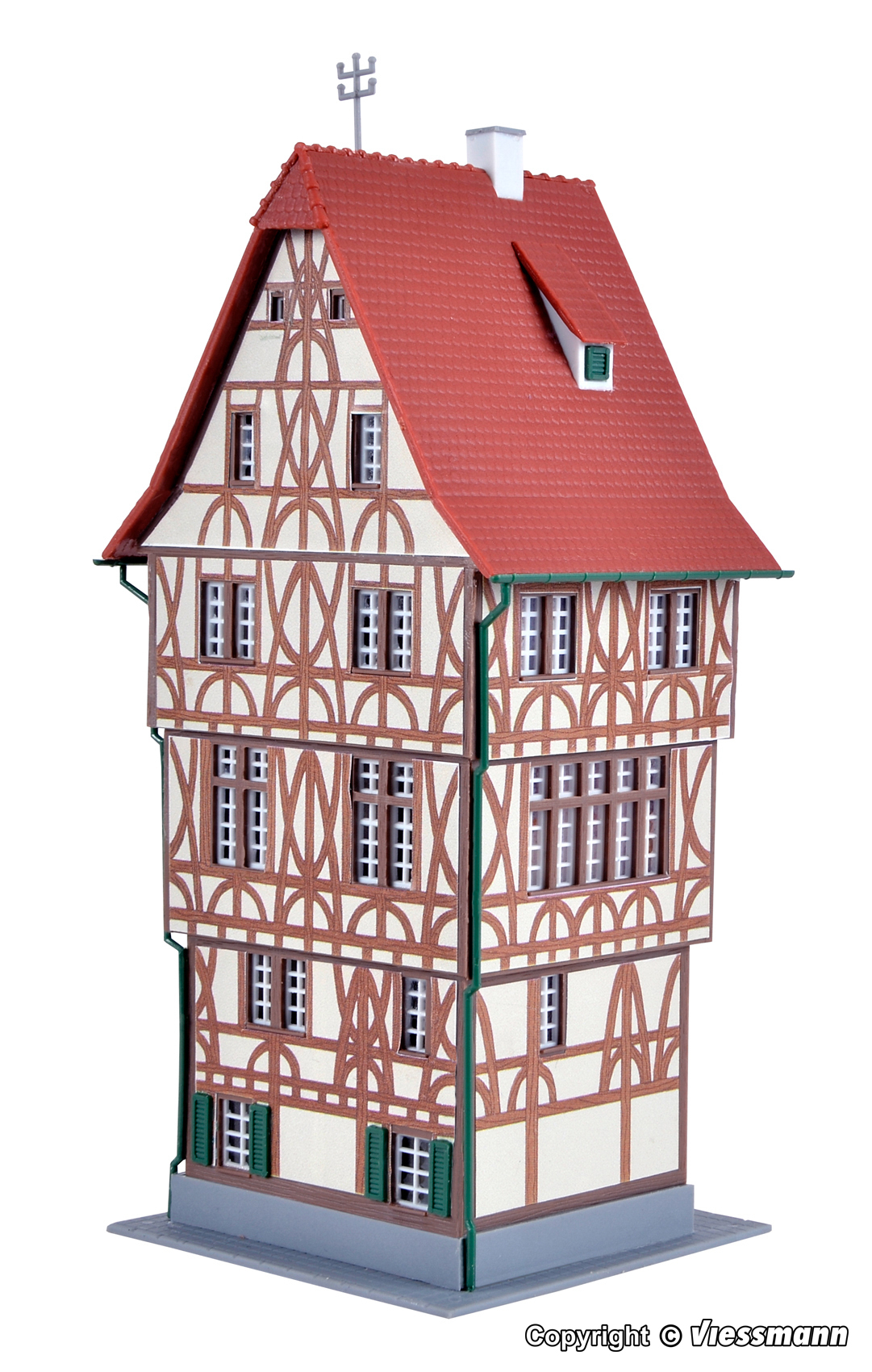 Bausatz. Dieser schlanke Fachwerkbau mit seinen geringen Grundmaßen fügt sich gut in einen dicht bebauten Stadtkern ein. Maße: L 6,5 x B 6 x H 14 cm. Schwierigkeitsgrad: 2 (Fortgeschrittene).