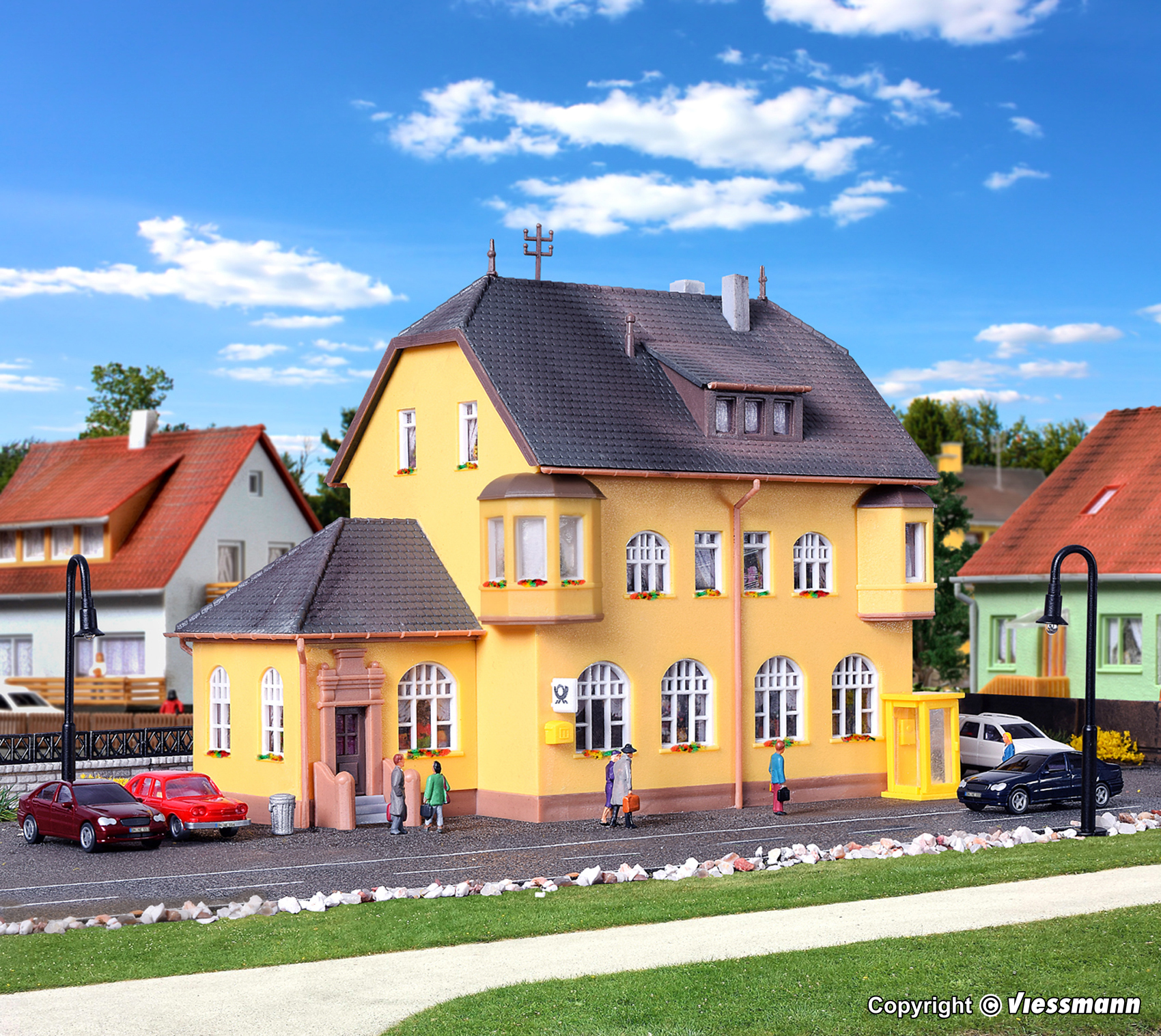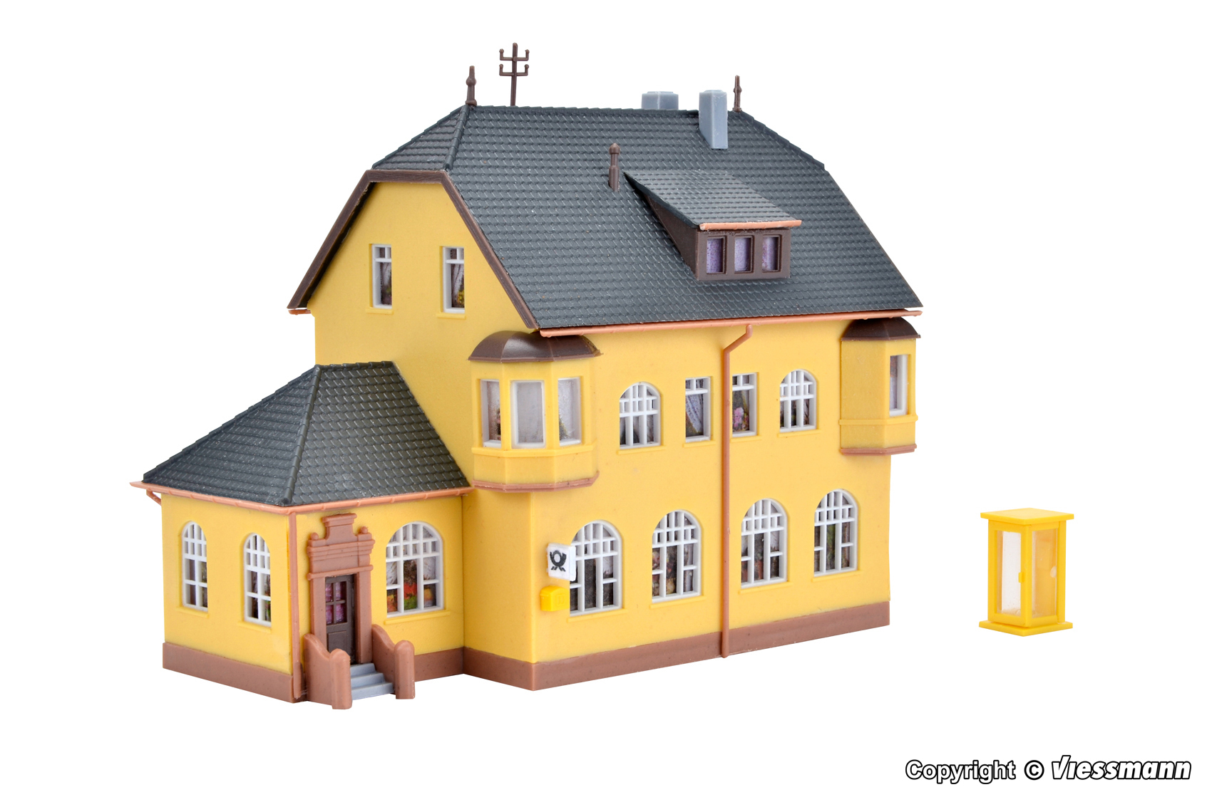 Bausatz. Das Gebäude wurde dem großen Vorbild bis ins Detail vorbildlich nachgestaltet. Auch vom architektonischen Gesamteindruck her macht es auf den Betrachter einen äußerst nachhaltigen Eindruck und kann sich auf jeder Modellbahnanlage sehen lassen: Eben einfache eine Post - so wie sie heute häufig als eigenstandiges Gebäude in der Wirklichkeit anzutreffen ist. Maße: 12,5 x 5,8 x 9 cm. Schwierigkeitsgrad: 2 (Fortgeschrittene)