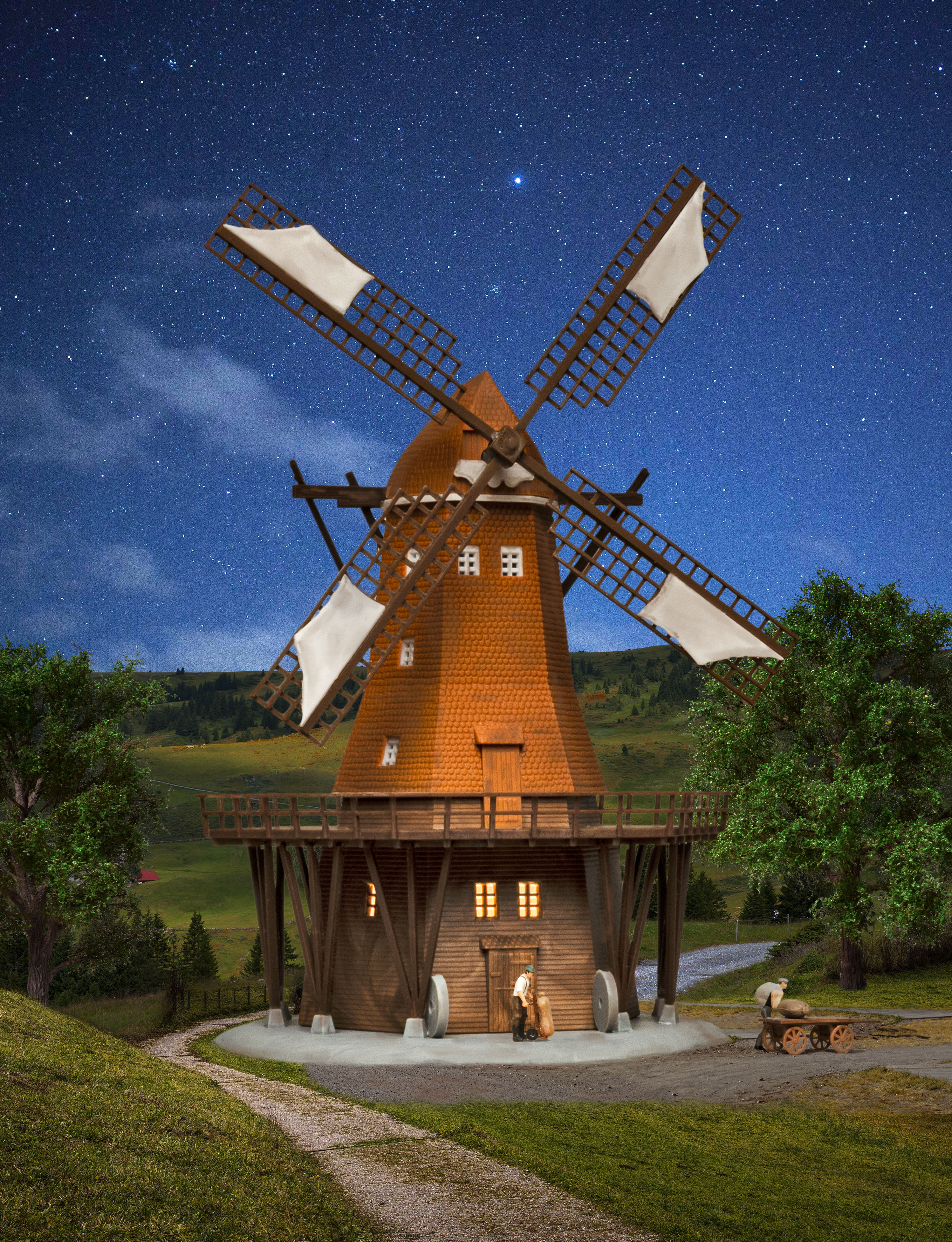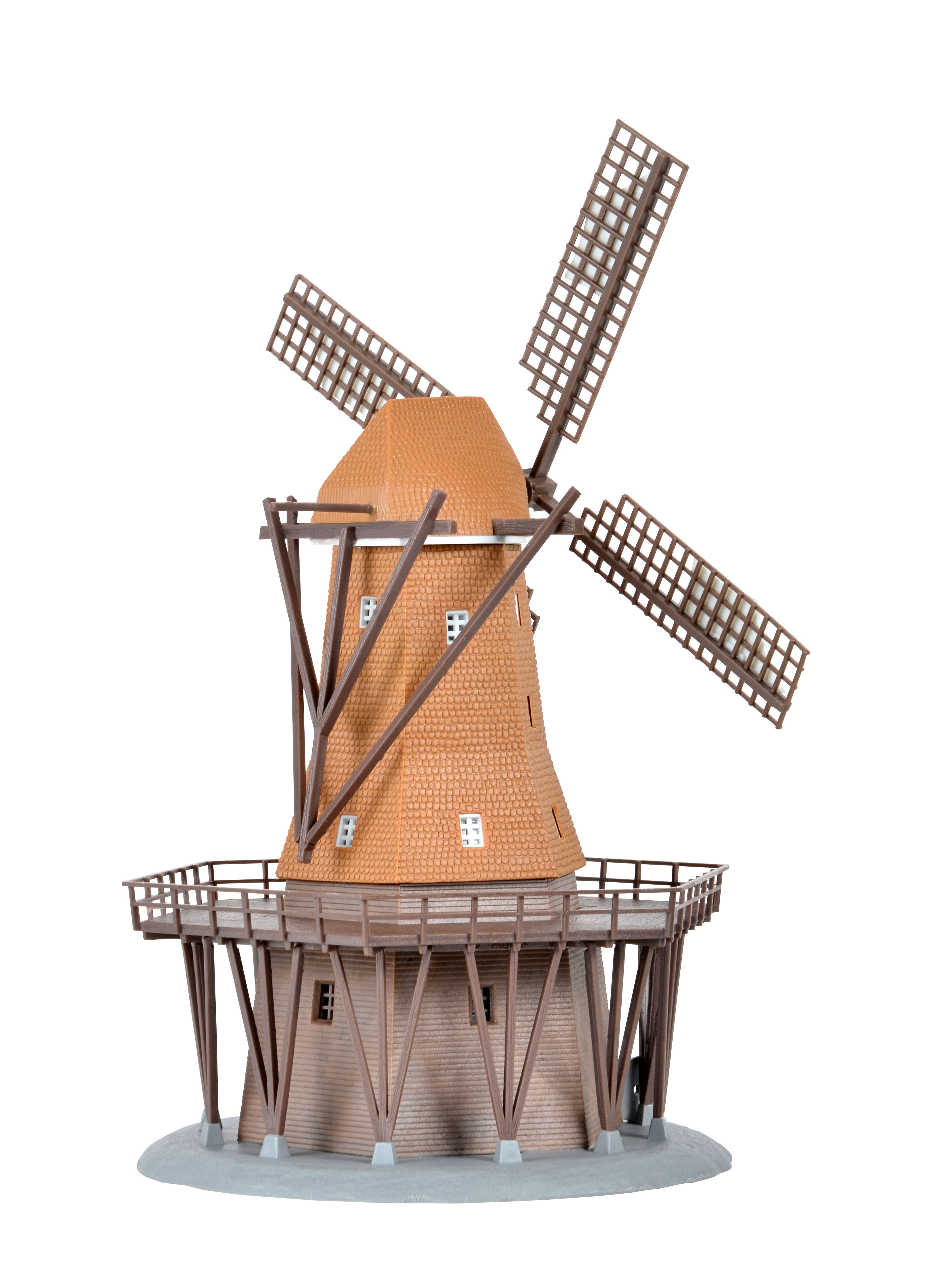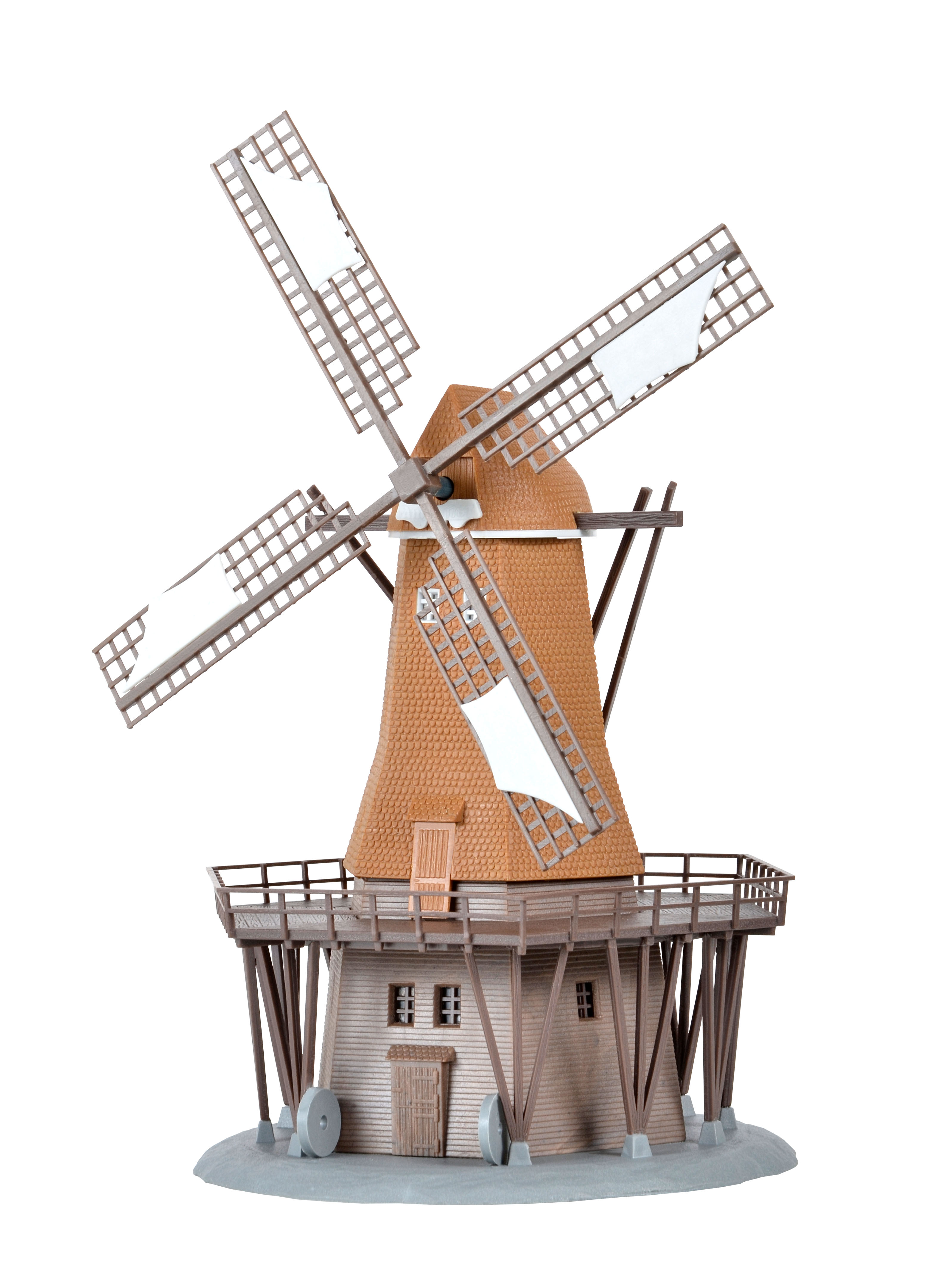 Bausatz. Dieses Modell ist der Nachbau der letzten Windmühle auf der Insel Fehmarn. Die Windmühle wurde 1787 als Grütz- und Graupenmühle errichtet und mit Windsegeln betrieben. Für das Kornmahlen hat sie heute ausgedient und wurde ab 1961 als Mühlenmuseum eingerichtet. Bei dieser Mühle dreht sich nur die Kappe mittels eines dreieckigen Sterts, nicht mehr das ganze Mühlenhaus, um die Mühlenflügel in unterschiedliche Windrichtungen auszurichten. Die gesamte Umkleidung des Mühlenrumpfes zeigt hölzerne Schindelplatten, die im Modell einen besonders gelungenen Kontrast zu den filigranen Flügeln ergeben. Maße: L 9 x B 9 x H 16 cm. Schwierigkeitsgrad: 2 (Fortgeschrittene).