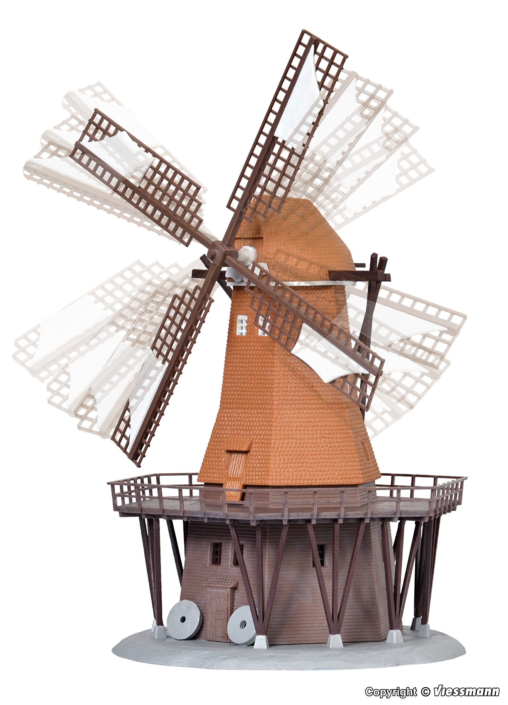 Funktionsbausatz. Bei diesem Mühlentyp dreht sich nur die Kappe mittels eines dreieckigen Sterts, nicht mehr das ganze Mühlenhaus, um die Mühlenflügel bei verschiedenen Winden nach den Himmelstrichtungen auszurichten. Die gesamte Umkleidung des Mühlenrumpfes zeigt hölzerne Schindelplatten, die im Modell einen besonders gelungenen Kontrast zu den filigranen Flügeln ergeben. Mit dem in der Kappe vormontierten Motor werden die Mühlenflügel angetrieben. Maße: L 9 x B 9 x H 16 cm. Schwierigkeitsgrad: 2 (Fortgeschrittene).