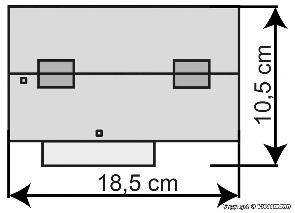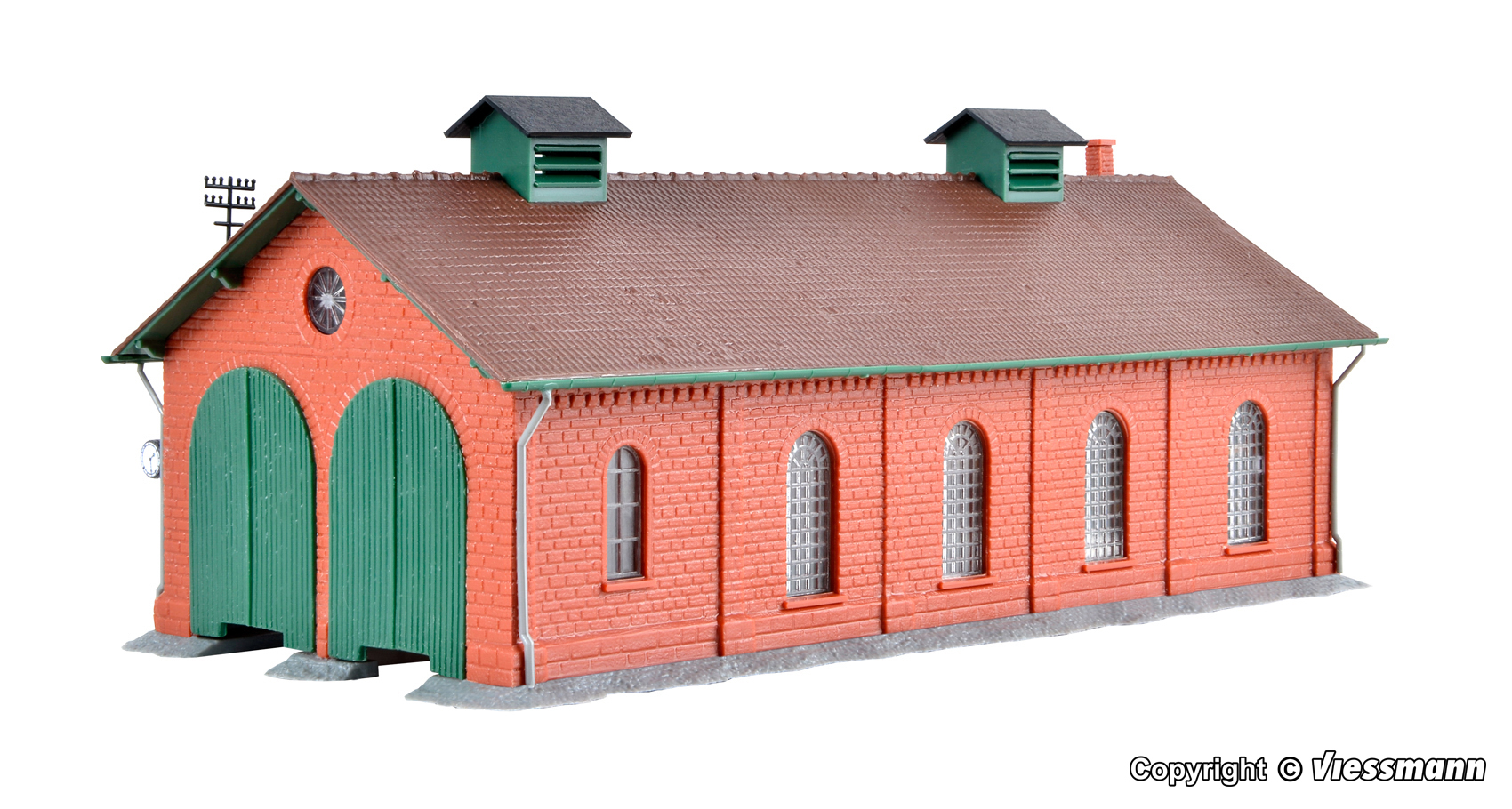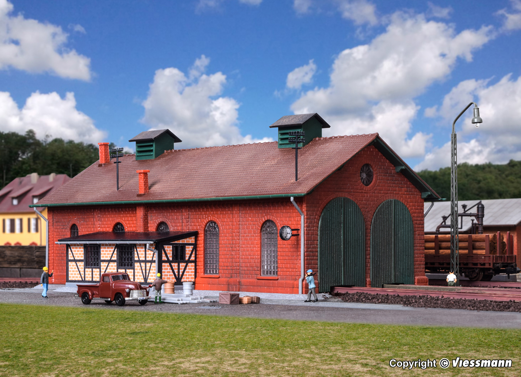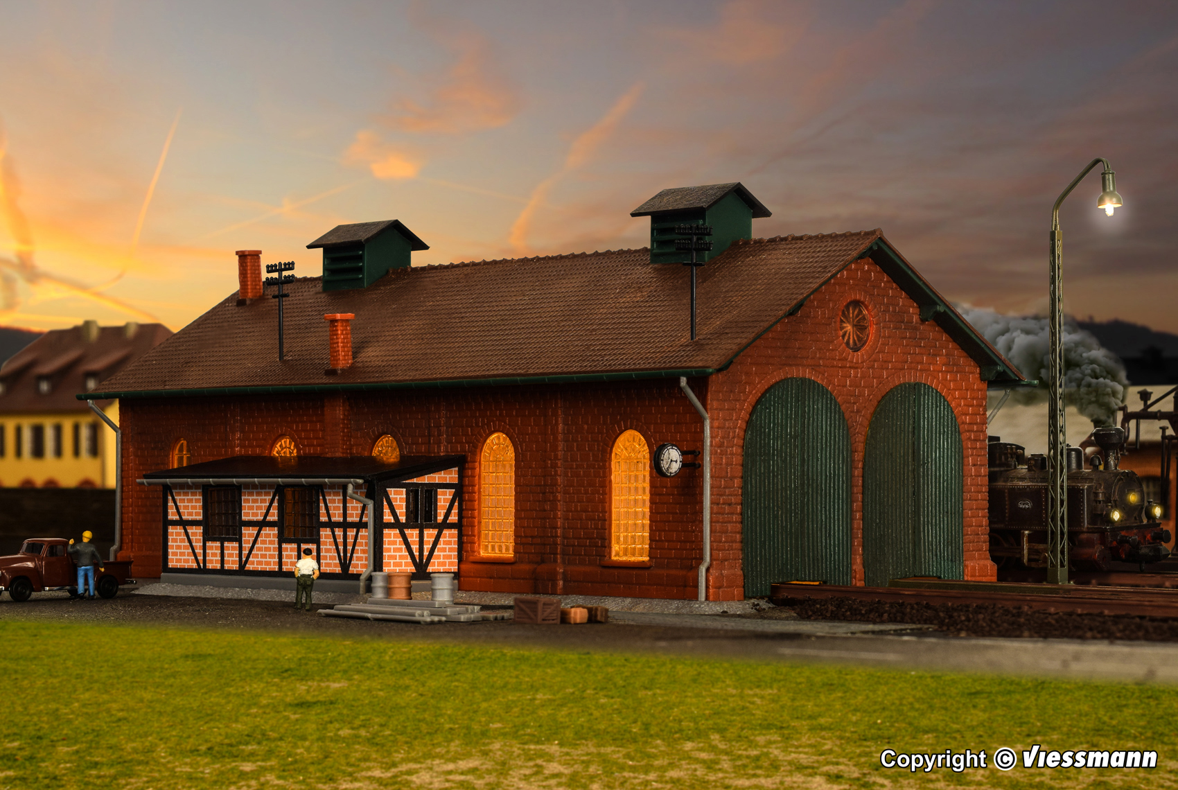 Bausatz. Lokschuppen in Backsteinbauweise mit kleinem Fachwerkanbau. Die Tore sind manuell beweglich. Maße: L 18,5 x B 10,5 x H 7,5 cm. Schwierigkeitsgrad: 2 (Fortgeschrittene).