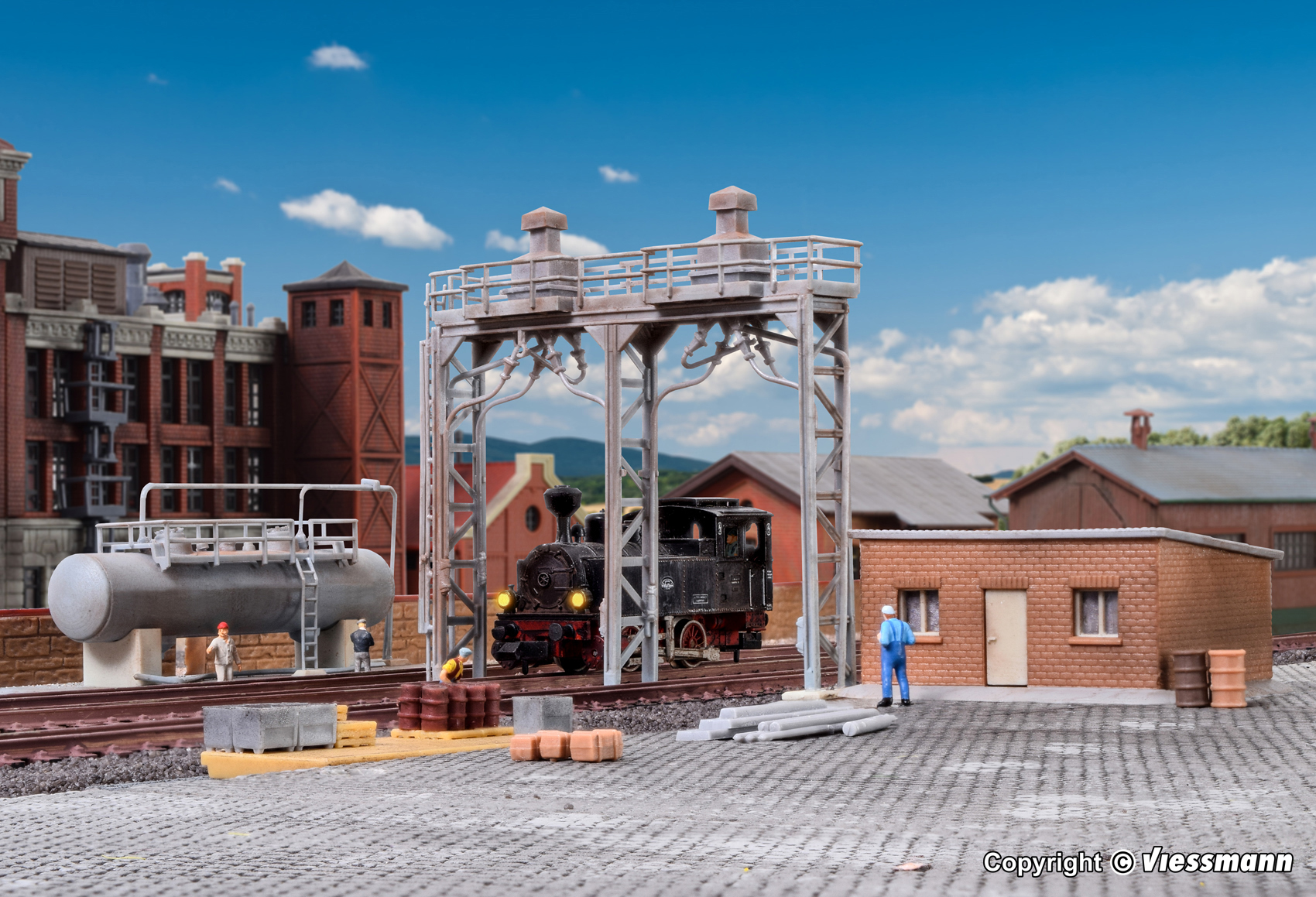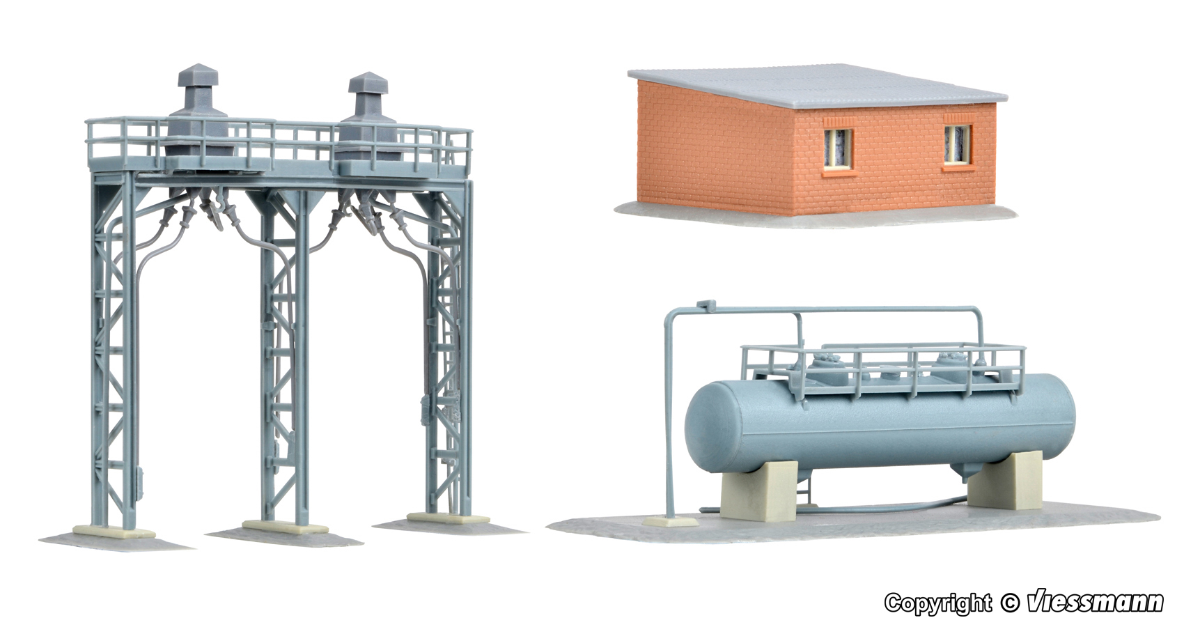 Bausatz. Die Besandungsanlage überspannt 2 Gleise. Zum Bausatz gehören außerdem eine Dieseltankstelle und ein kleines Nebengebäude. Durchfahrtshöhe: 4,5 cm. Durchfahrtsbreite: 2,0 cm. Maße: L 8 x B 3 x H 5,5 cm, Dieseltankstelle L 10 x B 4 x H 3,5 cm, kleines Gebäude L 5,5 x B 3,5 x H 2 cm. Schwierigkeitsgrad: 2 (Fortgeschrittene).