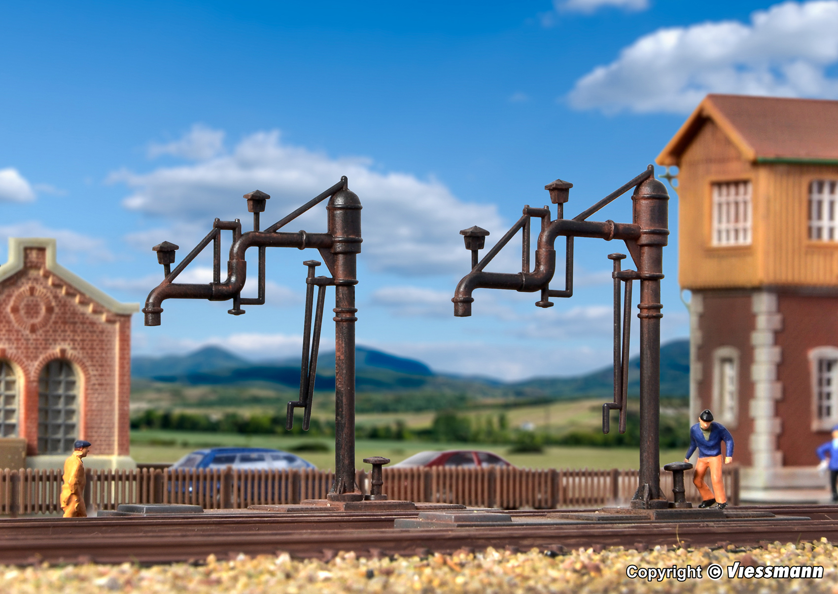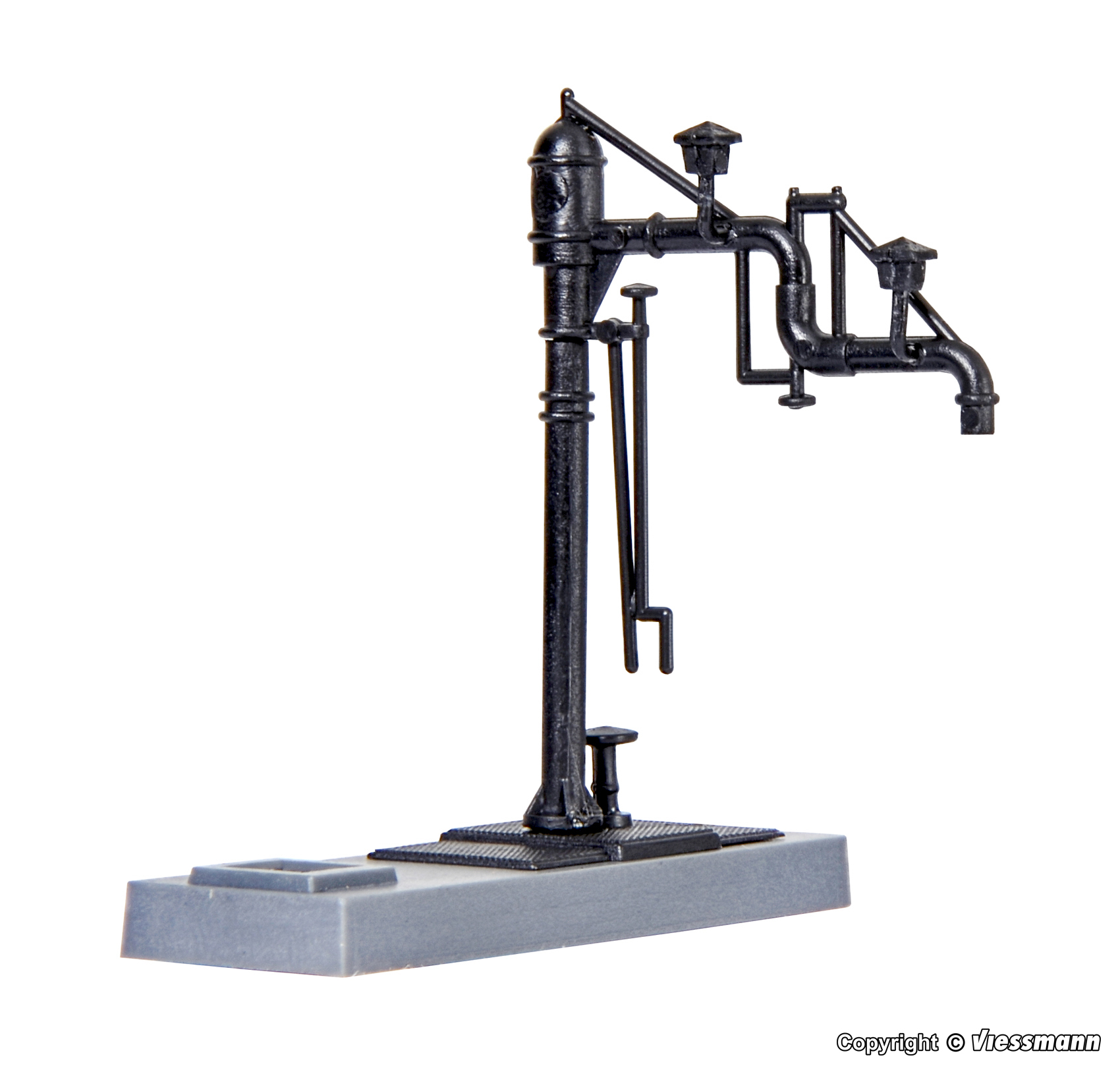 Bausatz. Musste die Dampflok eines Zuges Wasser nachfassen, so kam die Lok nicht immer genau an einem Wasserkran zum Stehen. Ein erneutes Anziehen oder Zurücksetzen hätte eine erhöhte Gefahr für ein- und aussteigende Reisende bedeutet. Durch den Gelenkausleger war ein gewisser Längenausgleich gegeben, um den Stutzen an die Einfüllöffnung des Wasserbehälters im Loktender heranzuführen, ohne dass der Zug anfahren musste. Häufig gehörten diese Art von Wasserkränen zum Bestand eines Bahnbetriebswerkes. Im Viessmann Sortiment auch als Funktionsmodell Art. 5832 erhältlich. Maße: je L 4,5 x B 1,3 x H 4,2 cm. Schwierigkeitsgrad: 2 (Fortgeschrittene).