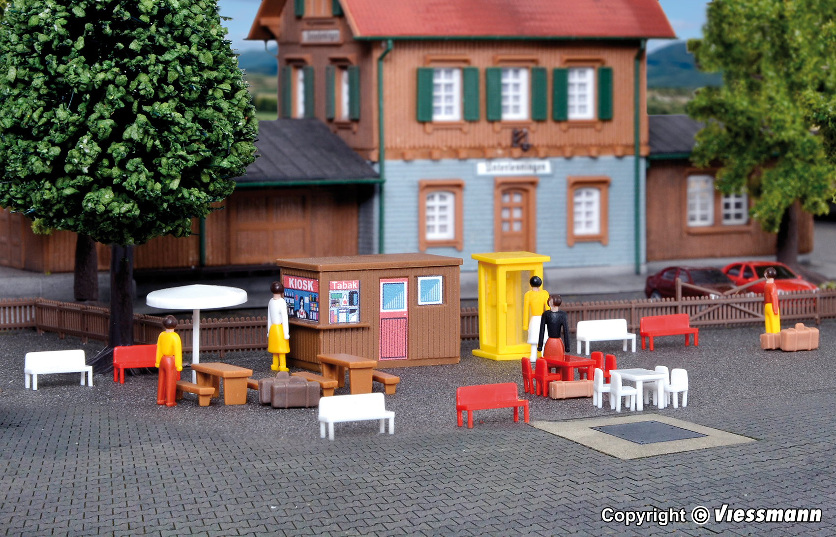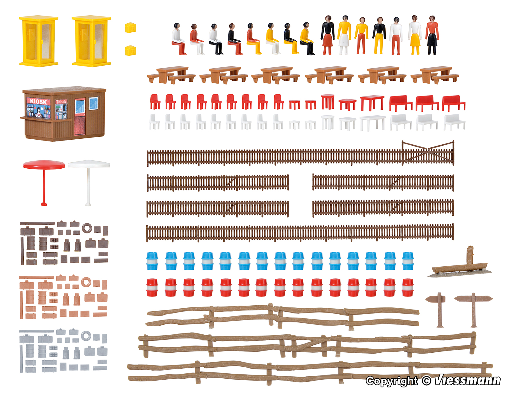 Bausatz. Umfangreiches Dekorationsmaterial mit Figuren, Zaunelementen, Sitzgruppen, Gepäck, Benzinfässern, Wegweisern, Telefonzellen und Kiosk. Schwierigkeitsgrad: 1 (Einsteiger).