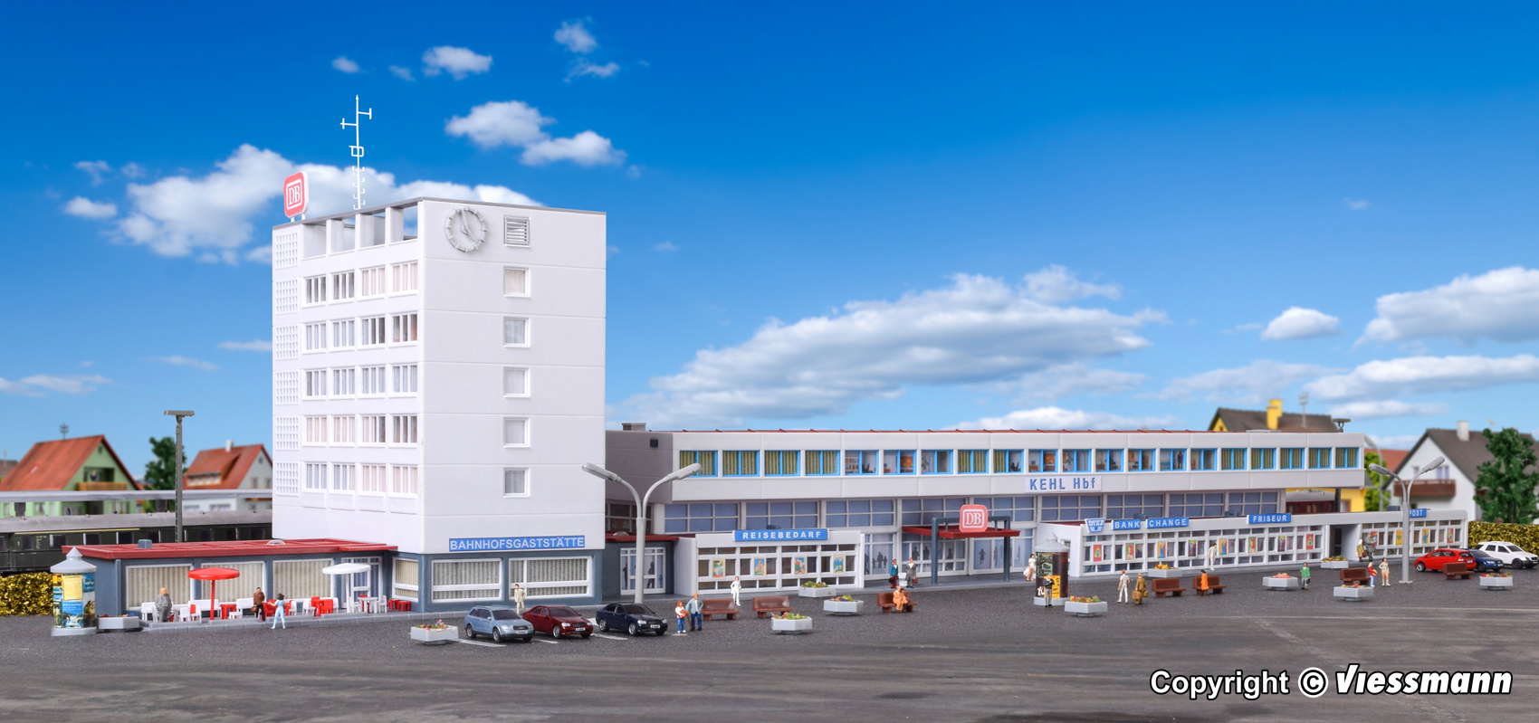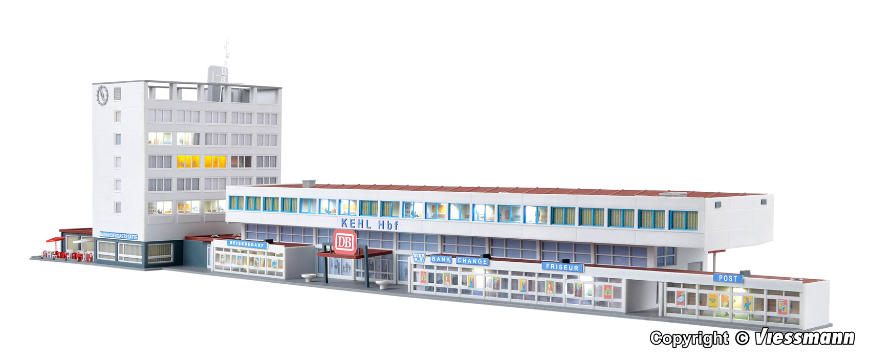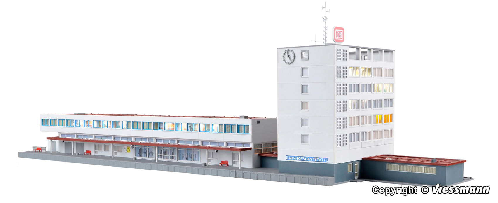 Funktionsbausatz. Dieser Bahnhof ist mit der praktischen und variablen Etageninnenbeleuchtung Art. 6045 von Viessmann ausgestattet. Diese bietet unbegrenzte Möglichkeiten zur individuellen Beleuchtung von Gebäuden mit großen Fensterfronten. Maße: L 65 x B 13,5 x H 13,5 cm. Schwierigkeitsgrad: 2 (Fortgeschrittene).