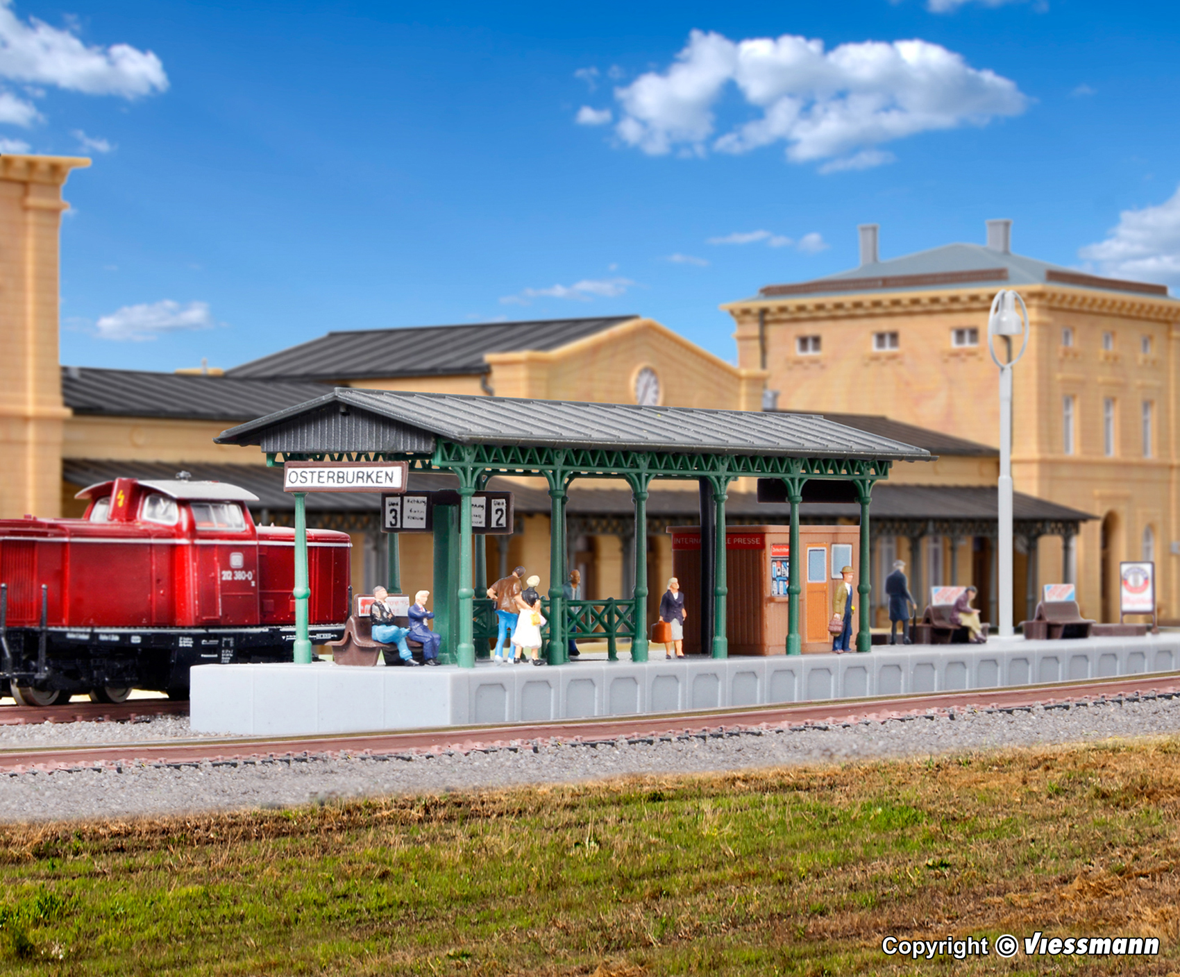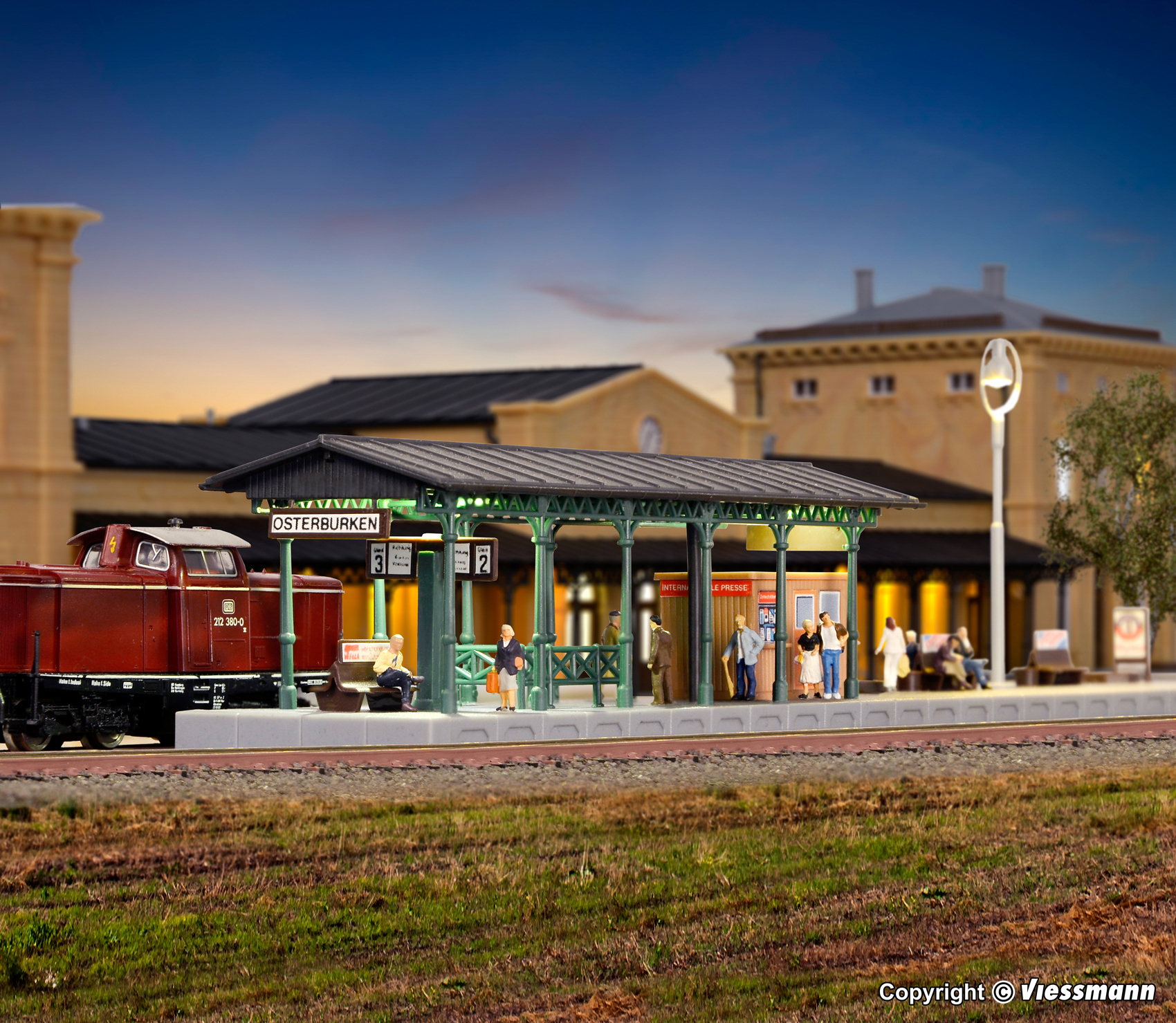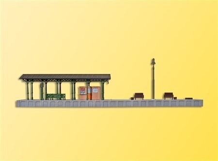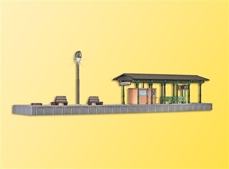 Funktionsbausatz. Der Bahnsteig ist ausgestattet mit 2 vormontierten LEDs warmweiß und einer nostalgischen Viessmann Bahnsteigleuchte mit LED Art.-Nr. 6435. Maße: L 22,8 x B 3,8 x H 6 cm. Schwierigkeitsgrad: 2 (Fortgeschrittene).