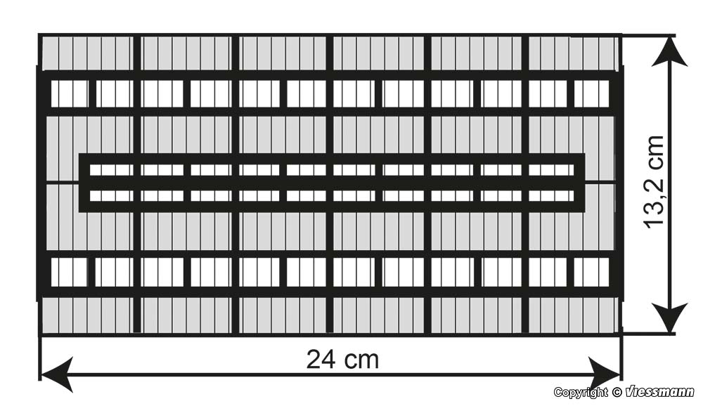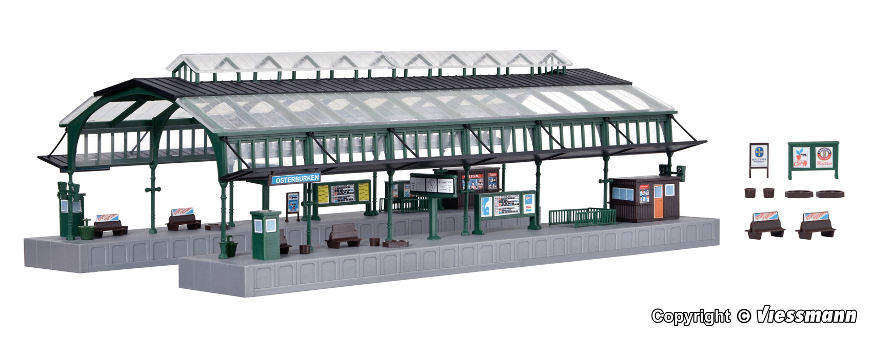 Bausatz. Gleise und Bahnsteige werden hier von einer interessanten Hallenkonstruktion aus Eisen und Glas raumwirksam überspannt. Mehrere Hallen können in beliebiger Länge und Breite hinter- bzw. nebeneinander aufgebaut werden, wobei sie je nach Wunsch oder vorhandener Anlage als Durchgangs- oder Kopfbahnhof eingesetzt werden können. Der Aufbau der gewölbten Dachkonstruktion bereitet im Modell keine Schwierigkeiten, lediglich die Montagereihenfolge der einzelnen Dachteile spielt eine Rolle. Geeignet für den Aufbau mit der Viessmann-Oberleitung. Durchfahrtshöhe: 6,5 cm. Durchfahrtsbreite: 5,5 cm. Maße: L 24 x B 13,2 x H 8 cm. Schwierigkeitsgrad: 2 (Fortgeschrittene).
