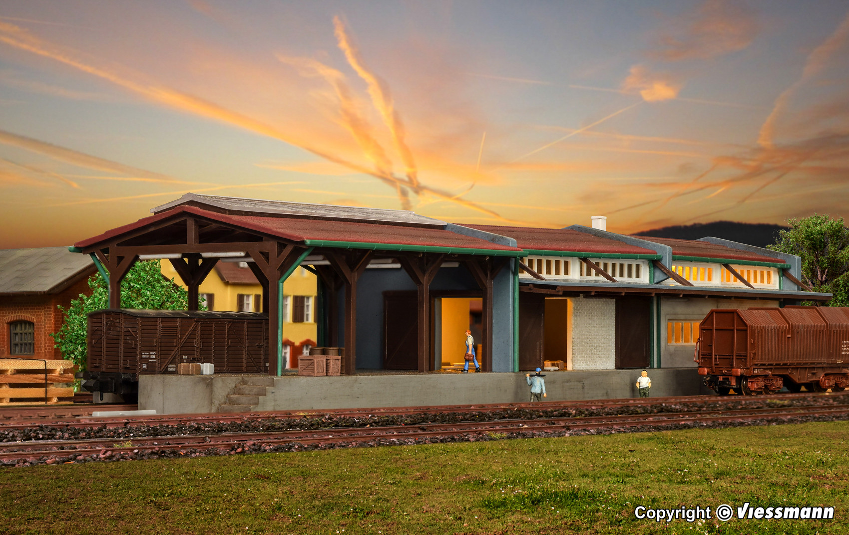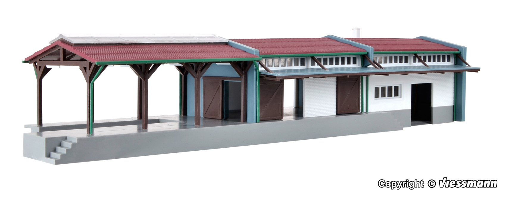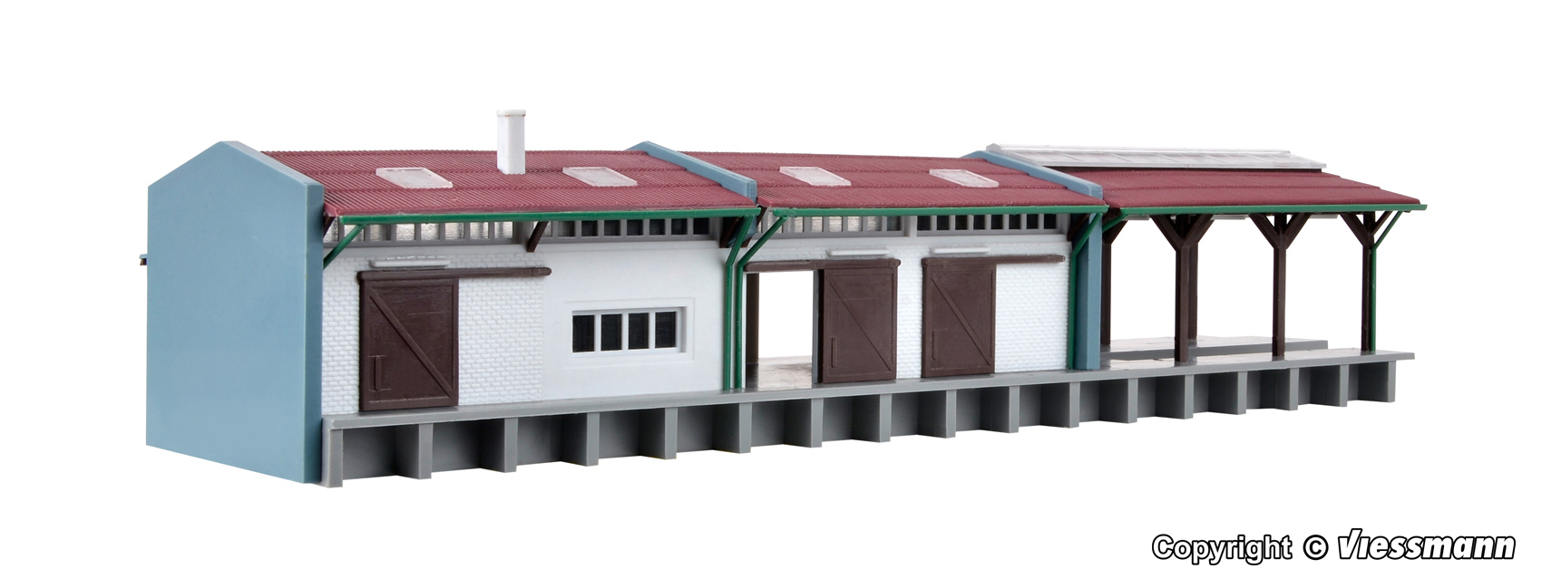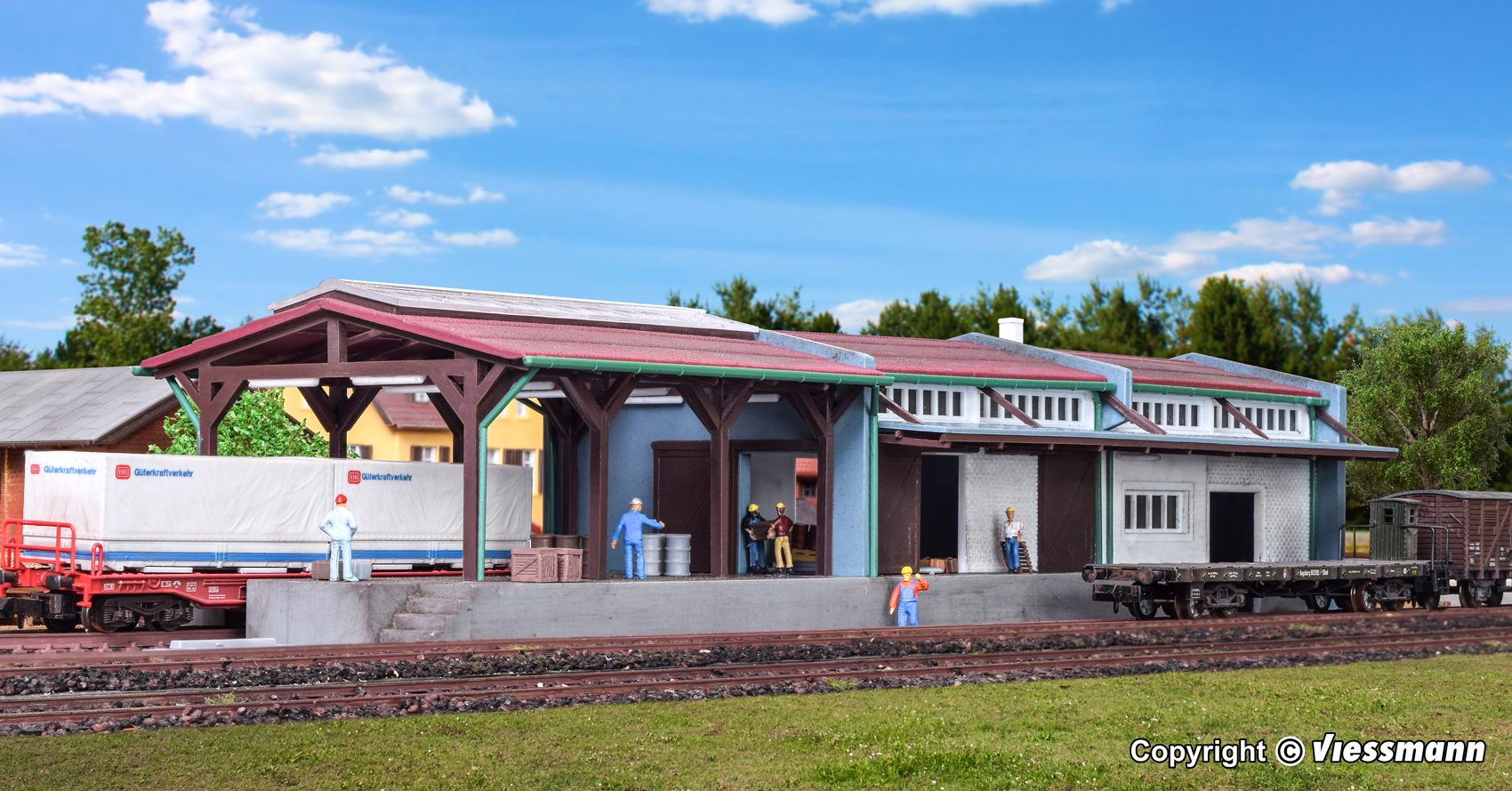 Bausatz. Dieser Güterschuppen in moderner Bauart bietet Platz für Stückgüter aller Art. Maße: L 27,3 x B 8,9 x H 5,7 cm. Schwierigkeitsgrad: 2 (Fortgeschrittene).