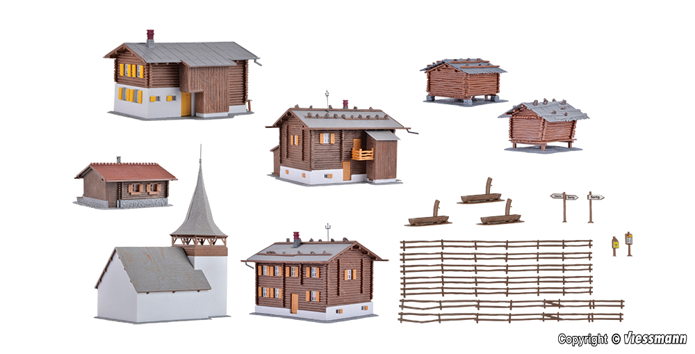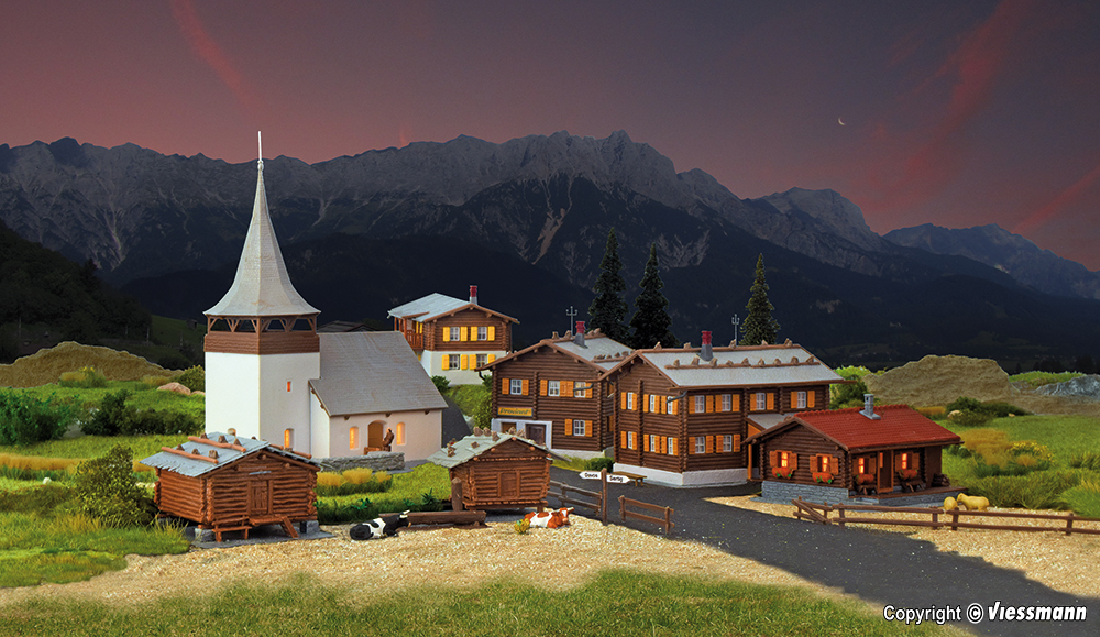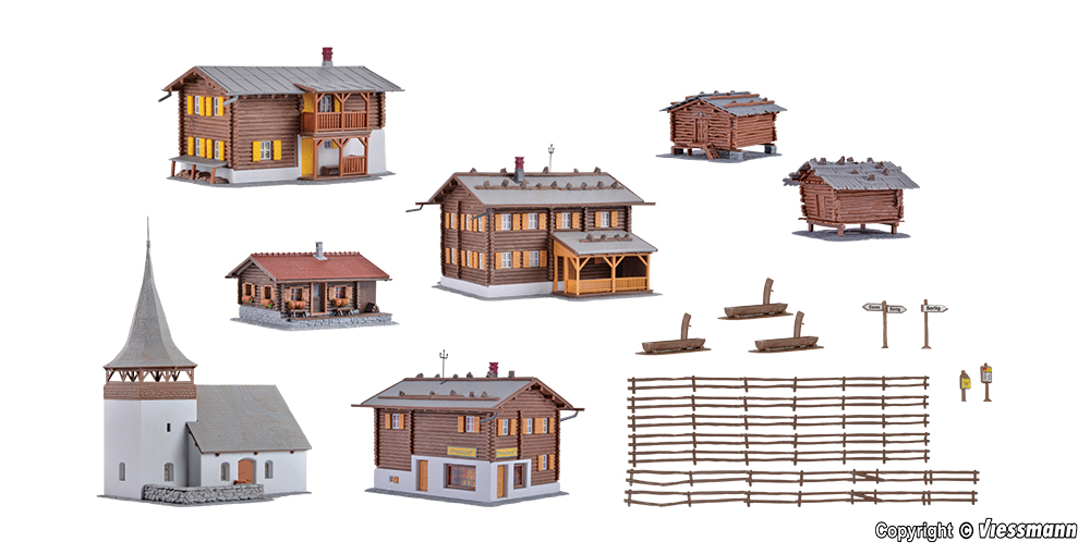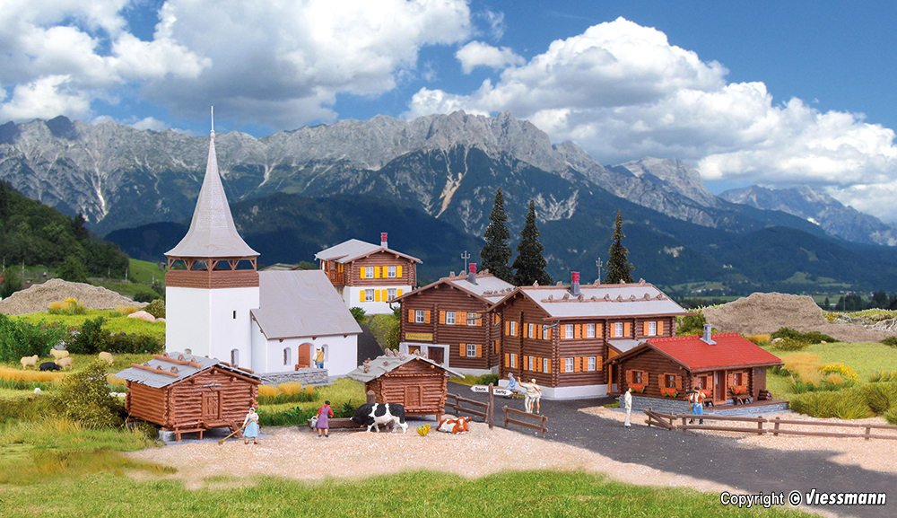 Bausatz. Mit diesem Set wird die Umsetzung eines kleinen vorbildgerechten Dorfes in ländlicher Umgebung zum Kinderspiel. Alle Gebäude passen perfekt zusammen, genau wie im Original. Das Set besteht aus 7 Artikeln: Art. 38001 Berghütte Seeblick, Art. 38002 Haus Edelweiß, Art. 38003 Touristenhaus , Art. 38004 Haus Sonnenhalde, Art. 38006 Dorfkirche Sertig, Art. 38007 Heustadel, 2 Stück und Art. 38008 Ländlicher Zaun. Maße: L 9 x B 8 x H 5 cm, L 10,5 x B 8,5 x H 6,5 cm, L 12 x B 8 x H 9 cm, L 12 x B 12,5 x H 9 cm, L 13 x B 10,5 x H 17,5 cm, L 6,5 x B 6 x H 4,3 cm und L 5,5 x B 5,5 x H 4 cm, Maße des Zauns variabel. Hergestellt im Zweifarben-Spritzgießverfahren. Schwierigkeitsgrad: 2 (Fortgeschrittene).