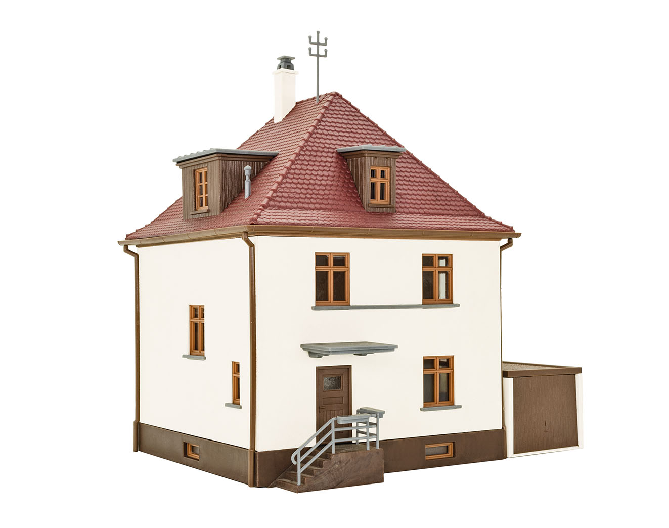 H0 Siedlungshaus mit Garage - Bausatz. Siedlungshaus mit Garage und Zaun. Haus: L 13,6 x B 12,5 x H 13,5 cm Zaun: 192 x 1,4 cm Schwierigkeitsgrad: 2 (Fortgeschrittene)