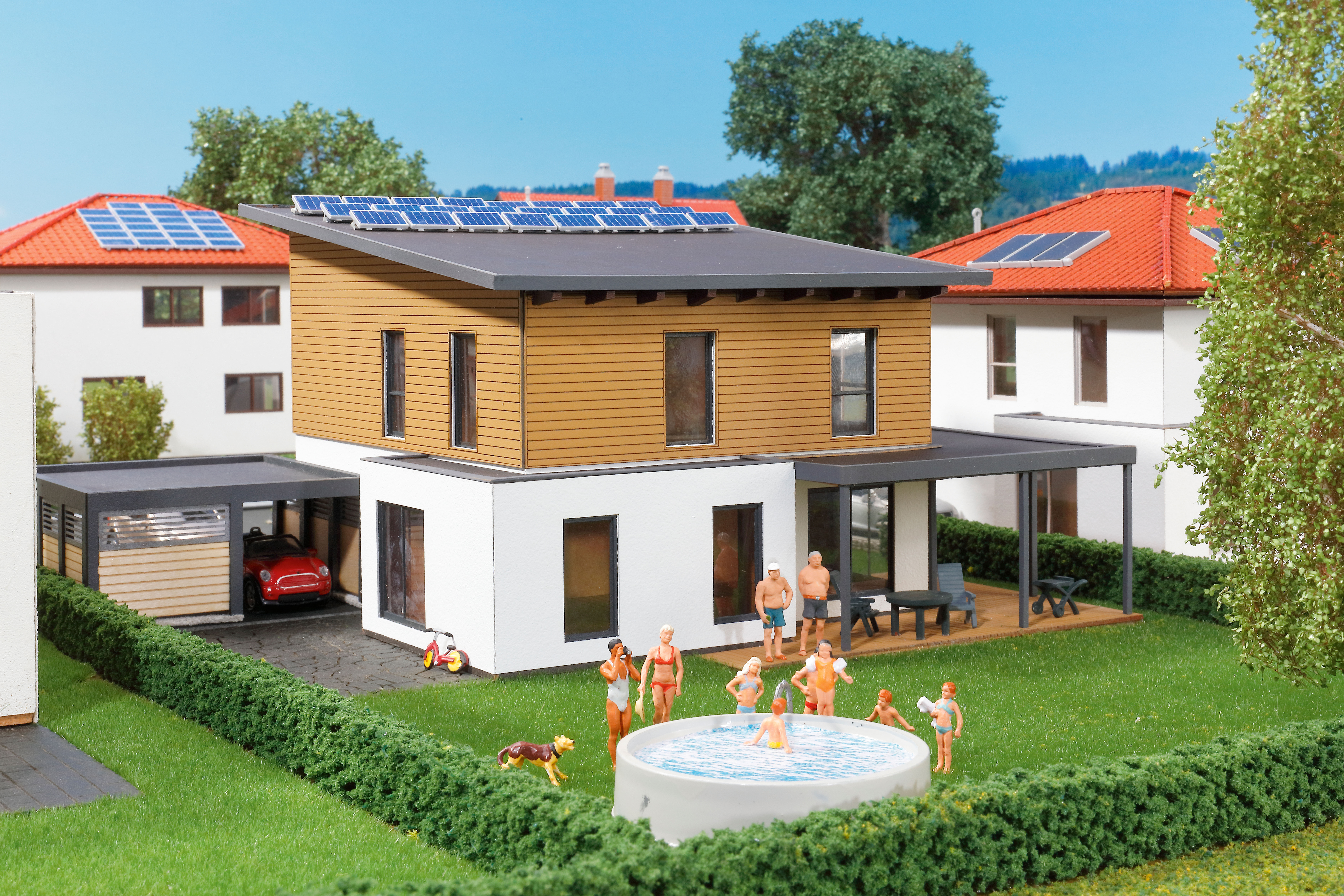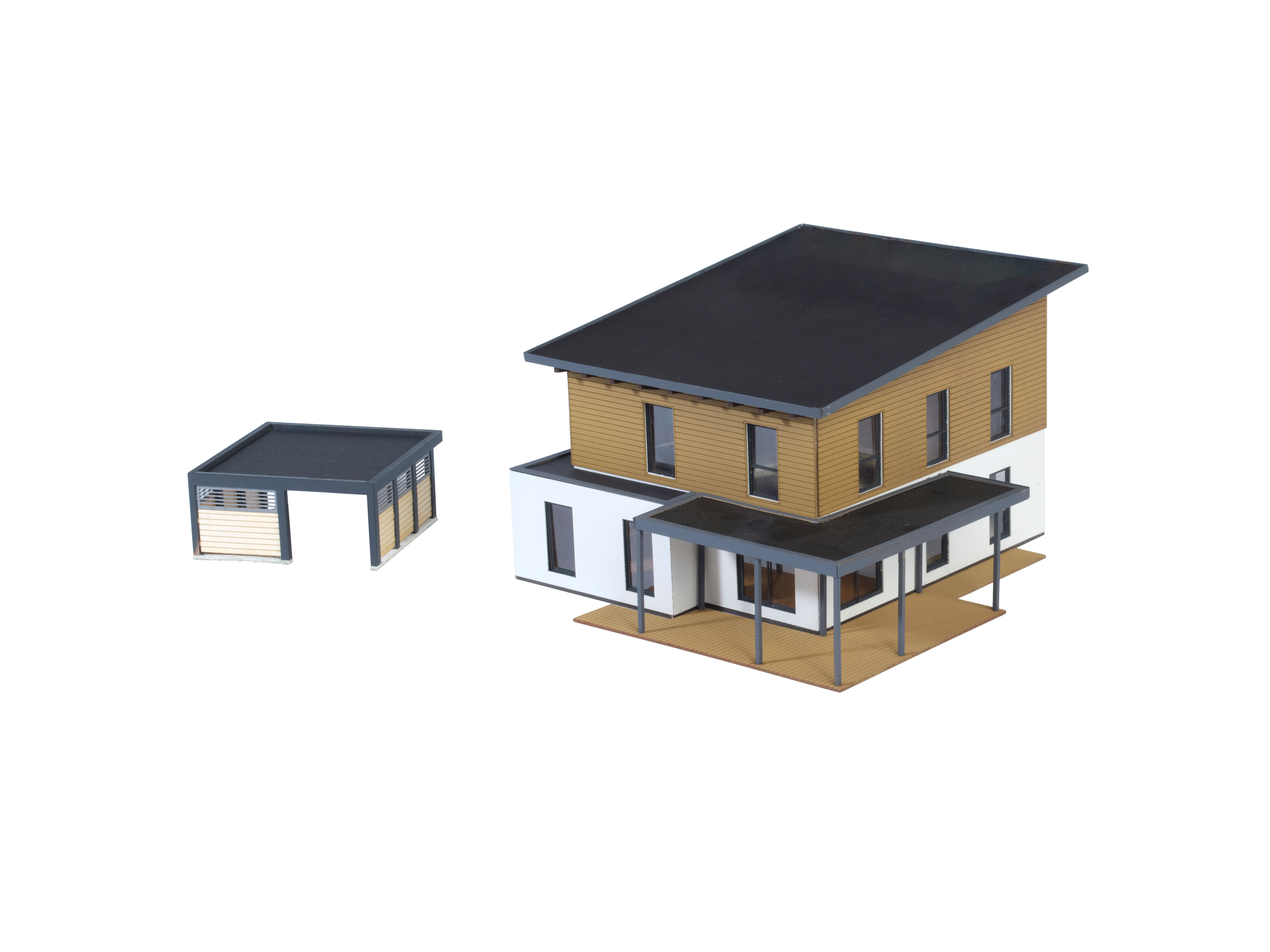 H0 Kubushaus Saskia mit Carport- Polyplate Bausatz - Bausatz. Modernes Fertighaus mit Pultdach und Carport aus Polyplate Verbundwerkstoff. Passende überdachte Terrasse Art. 38345. L 11,9 x B 15,4 x H 9,5 cm Schwierigkeitsgrad: 2 (Fortgeschrittene)