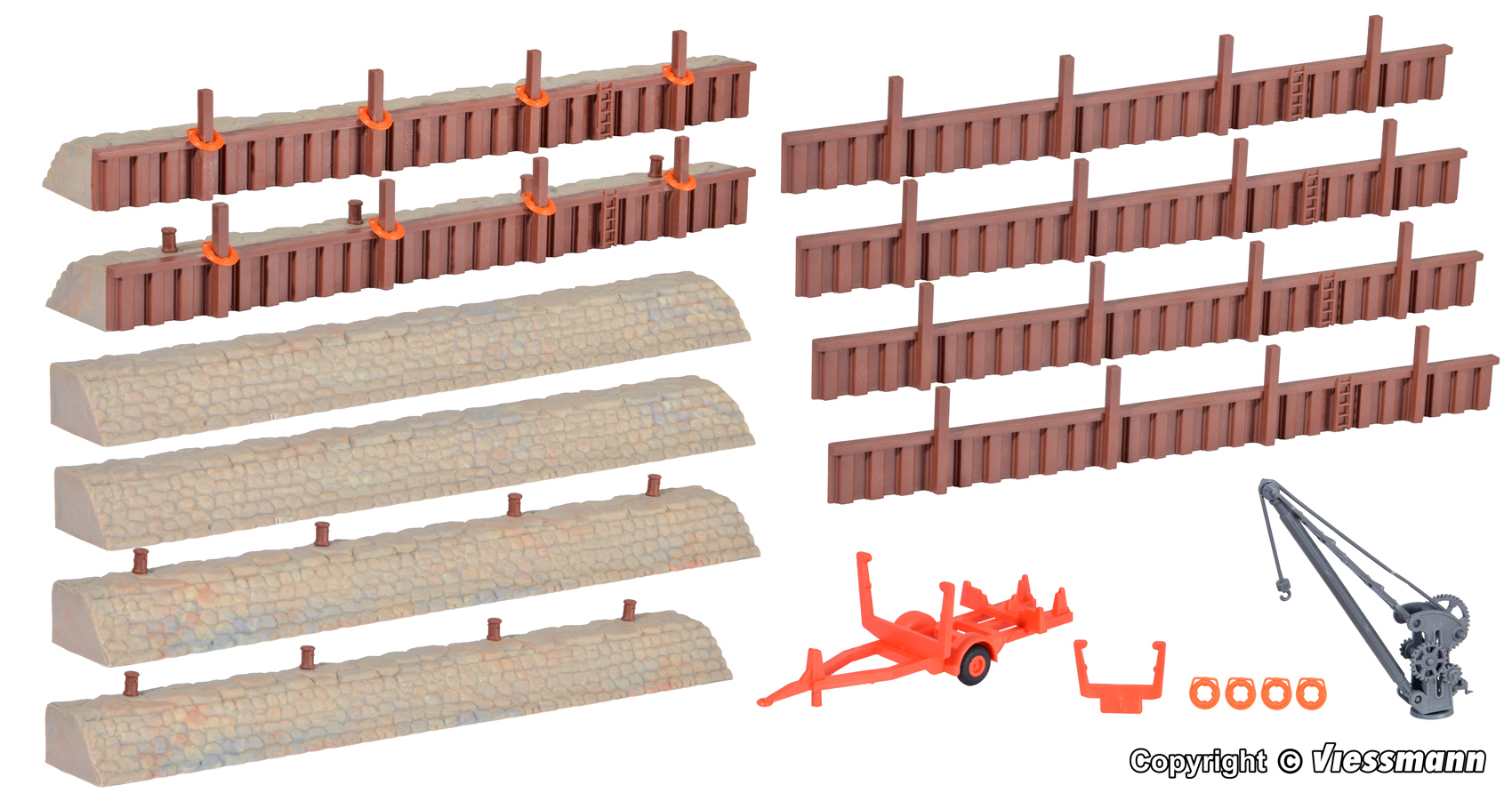 Bausatz. Ob Spundwände aus Bohlen oder gemauerte Dammstücke ? mit diesen Stützmauern lässt sich eine Vorbildsituation an einem Hafenbecken oder Bahndamm hervorragend im Modell wiedergeben. Neben den Kaimauern beinhaltet das Set diverse andere Kleinteile, z. B. Rettungsringe. Mit dem handbetriebenen Hafenkran lässt sich ein kleines Motorschiff oder eine Segeljacht wirklichkeitsnah vom Bootsanhänger zu Wasser lassen. Maße: L max. 119,5 cm x H max. 6 cm. Schwierigkeitsgrad: 1 (Einsteiger).