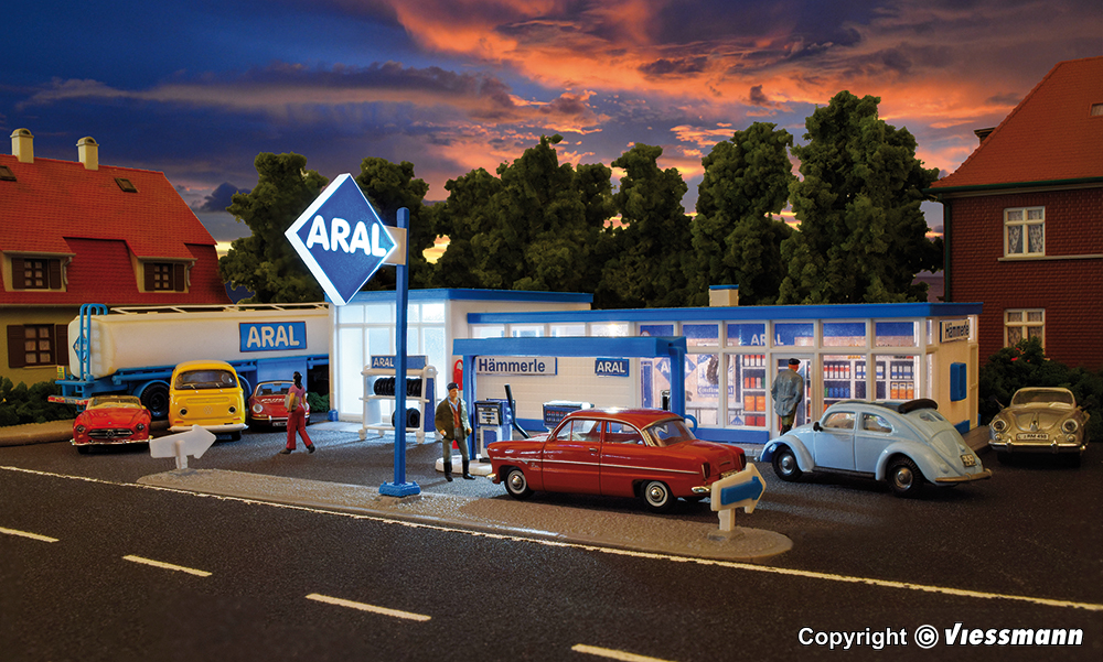 Funktionsbausatz. Die Tankstelle ist im Verkaufsraum mit warmweißen LEDs und in der Reparaturwerkstatt mit weißen LEDs ausgestattet. Zusätzlich sind das ARAL-Schild und das Dach über den Zapfsäulen beleuchtet. Passend dazu erhältlich ist die beleuchtete Zapfsäule von Viessmann Art. 1364 und Art. 5131 Hebebühne, bewegt. Maße: L 19,5 x B 9 x H 4,5 cm. Schwierigkeitsgrad: 2 (Fortgeschrittene).
