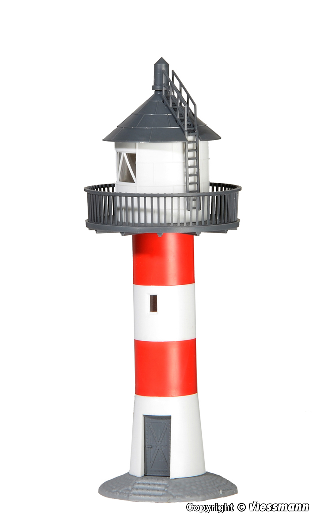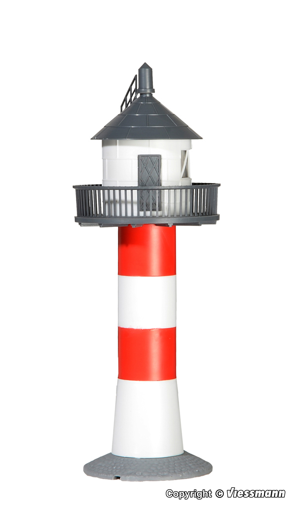 Bausatz. Der Turm ist durch seinen roten Anstrich mit 2 weißen waagerechten Bändern weithin gut sichtbar. Leuchttürme dieser Art werden überall an der Küste und an küstennahen Wasserstraßen als Schifffahrtszeichen betrieben. Die Energieversorgung für das Leuchtfeuer erfolgte früher häufig mit Dieselaggregaten, heute sind die Leuchttürme an die öffentliche Stromversorgung angeschlossen. Entsprechend dem Vorbild hat der Turmbau an der Spitze einen Laternenraum mit einer umlaufenden Galerie, die sich optisch gut von dem schlanken Turm abhebt. Mit Stecksystem. Maße: Max. Ø 6 x H 16 cm. Schwierigkeitsgrad: 2 (Fortgeschrittene).