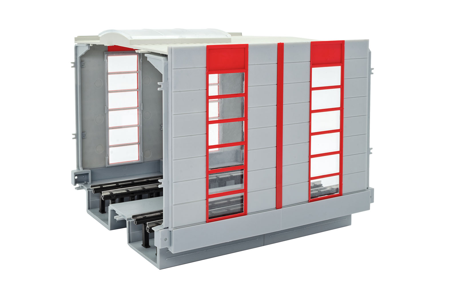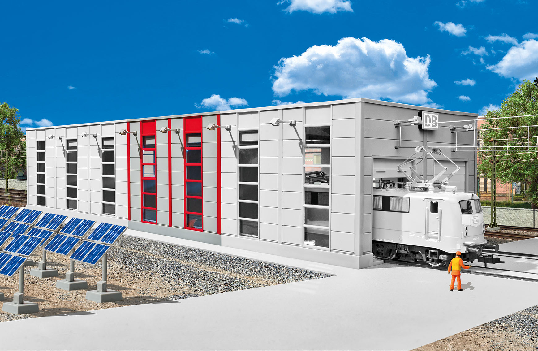 Bausatz. Erweiterungs-Set zur individuellen Verlängerung der Wartungshalle Deutsche Bahn, Art. 39256 (je Feld ca. 7 cm). Inhalt: Je 2 Elemente für beide Seiten, Dachteile, Schienenprofile, Grube. Für 2- und 3-Leiter Systeme geeignet.