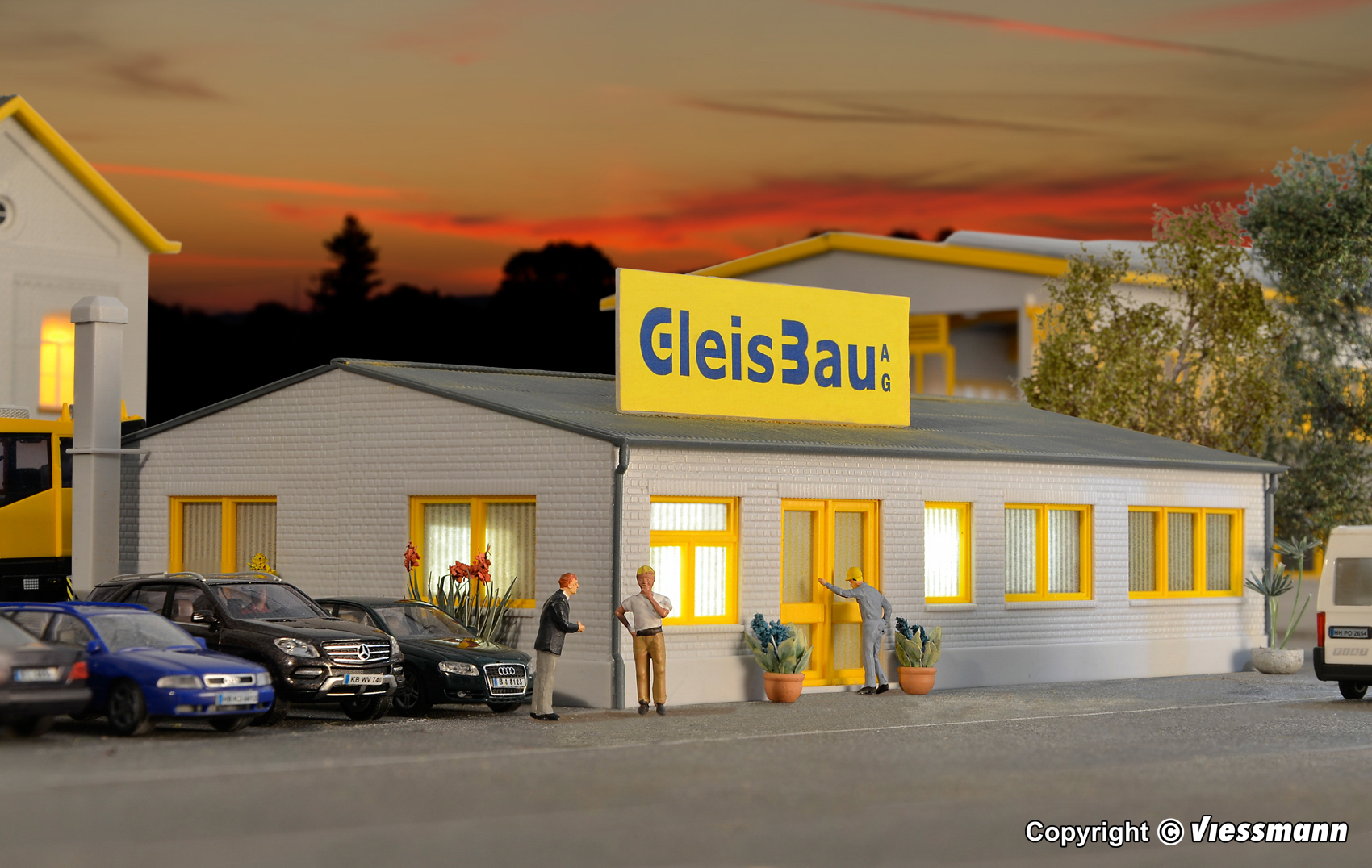 Bausatz. Zusammen mit der Wartungshalle Art. 39324 und dem Verwaltungsgebäude Art. 39323 entsteht ein kompletter Betriebshof der Firma GleisBau. Dazu passen die Schienenfahrzeuge zum Thema Gleisbau von
