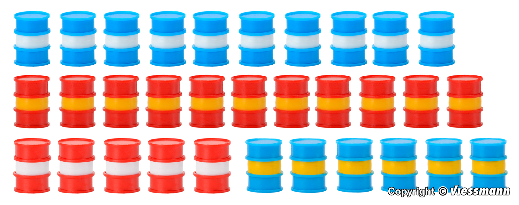 Bausatz. Benzinfässer von Shell, ARAL und Esso. Ø 0,8 cm, H 1,1 cm. Schwierigkeitsgrad: 1 (Einsteiger).