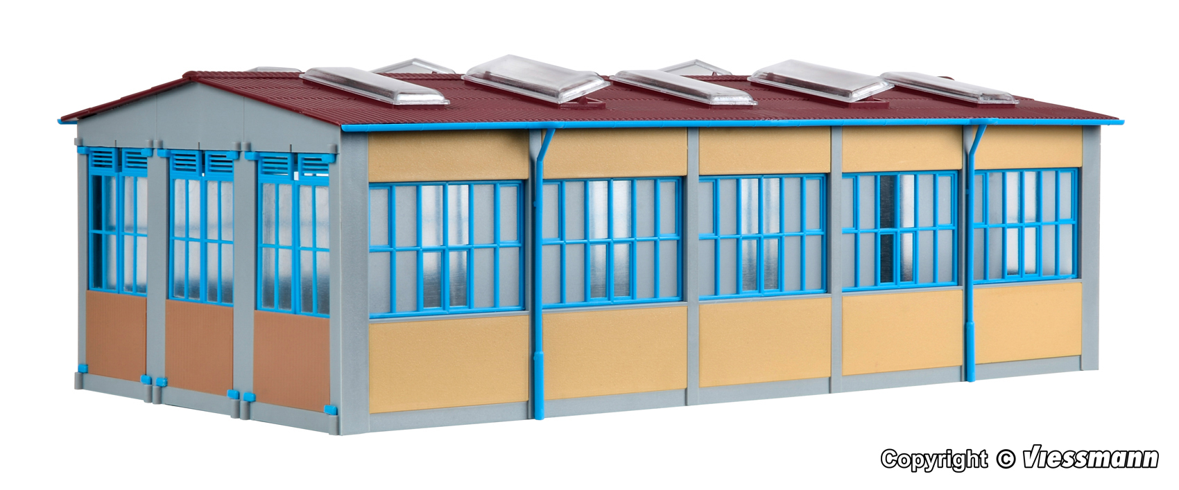 Bausatz. Dieser moderne Lokschuppen eignet sich für den Einsatz in den Epochen III – V. Die großen Fensterflächen sorgen für gute Lichtverhältnisse im Innenraum, wo Reparatur- und Revisionsarbeiten durchgeführt werden können. Die Tore sind manuell beweglich. Für den Einbau einer Oberleitung geeignet. Der Lokschuppen kann mit einem weiteren Bausatz 39450 um weitere drei Stände erweitert werden. Durchfahrtshöhe: 8,5 cm, Durchfahrtsbreite: 3,7 cm. Gleismittenabstand: 5,75 cm. Maße: L 34,5 x B 20 x H 11,5 cm.