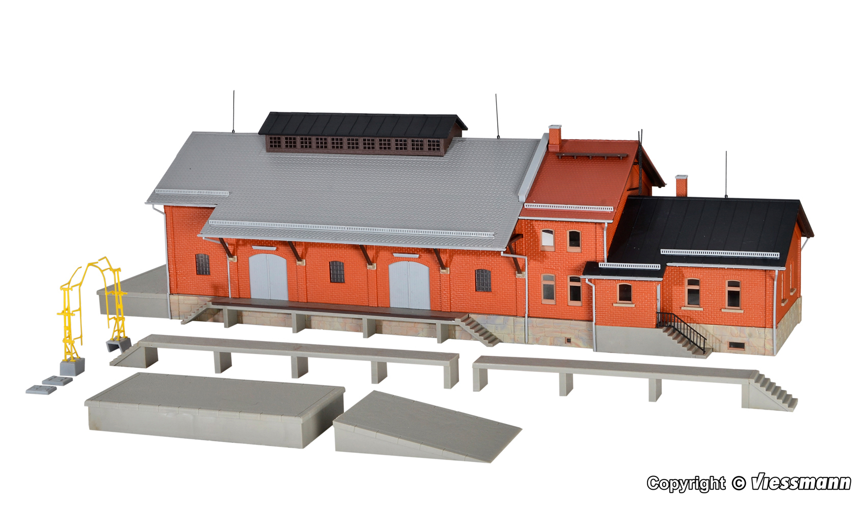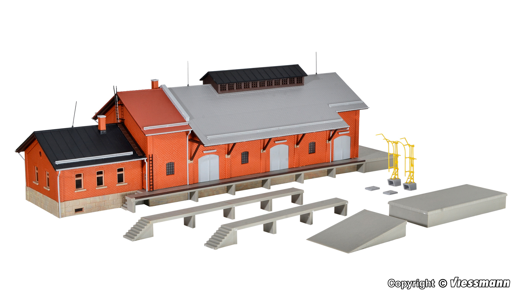 Bausatz. Der Güterumschlag ist ein fester Bestandteil der Eisenbahn. Diese Halle eignet sich zur Unterbringung von Gütern aller Art. Die Rampenteile können flexibel aufgebaut werden. Das Lademaß dient der Kontrolle, ob ein Güterwagen überladen hat. Maße: L 47 x B 19,5 x H 15 cm. Schwierigkeitsgrad: 2 (Fortgeschrittene).