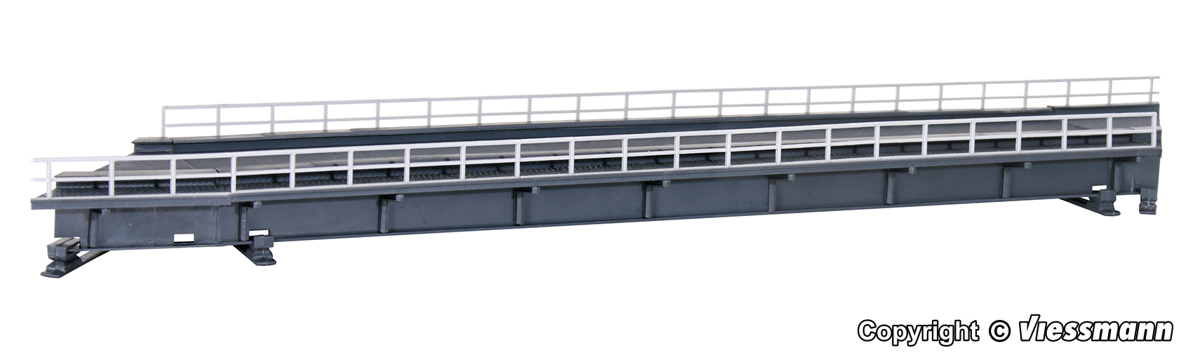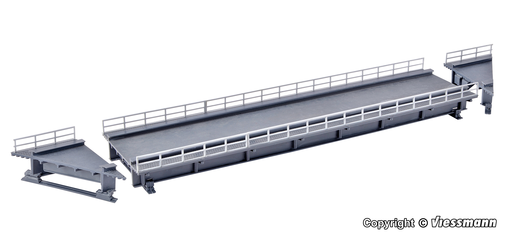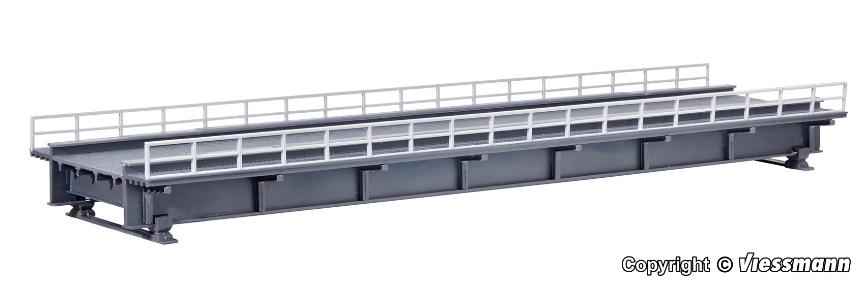 Bausatz. In doppelter Ausführung ist ein zweigleisiger Aufbau möglich. Gleisabstand bei zweigleisigem Aufbau (von Gleismitte zu Gleismitte) 6,8 cm. Brückenköpfe nicht enthalten. Inklusive 2 abgeschrägter Verlängerungsbauteile. Für alle gängigen Gleissysteme geeignet. Dazu passen die Brückenköpfe Art. 39752 und der Mittelpfeiler Art. 39751. Maße: L 27 x B 7 x H 3 cm. Fahrbahnhöhe: 2 cm. Schwierigkeitsgrad: 2 (Fortgeschrittene).