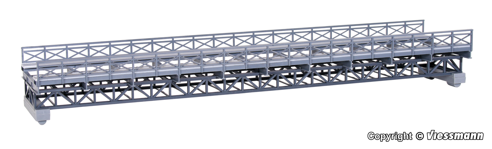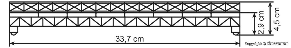 Brückenköpfe nicht enthalten. In doppelter Ausführung ist ein zweigleisiger Aufbau möglich. Für alle gängigen Gleissysteme geeignet. Dazu passen die Brückenköpfe Art. 39750 und die Mittelpfeiler Art. 39753 und 39751. Gleisabstand bei zweigleisigem Aufbau (von Gleismitte zu Gleismitte) 6,5 cm. Maße: L 33,7 x B 6,6 x H 4,5 cm, Fahrbahnhöhe: 2,9 cm. Fahrbahnbreite: 3,7 cm. Schwierigkeitsgrad: 2 (Fortgeschrittene).