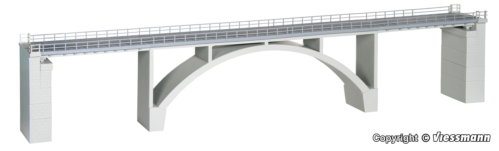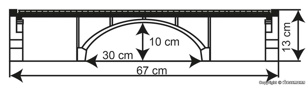 Bausatz. Mit Brückenköpfen. In doppelter Ausführung ist ein zweigleisiger Aufbau möglich. Für alle gängigen Gleissysteme geeignet. Durchfahrtshöhe: 10 cm, Durchfahrtsbreite: 30 cm. Maße: L 67 x B 8 x H 13 cm, Fahrbahnhöhe: 12 cm. Schwierigkeitsgrad: 2 (Fortgeschrittene).