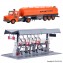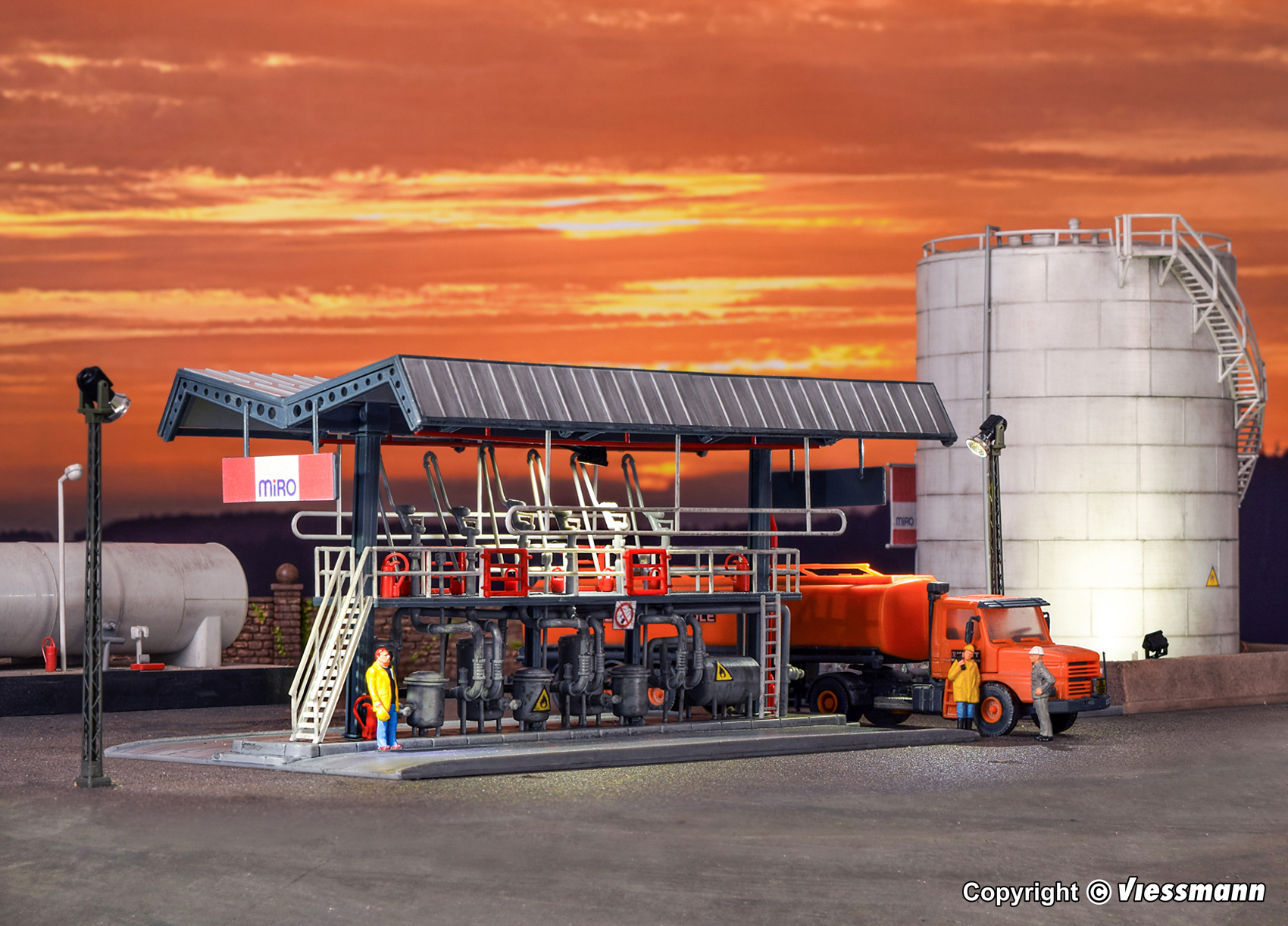 Bausatz. Die MIRO Mineralölanlage von kibri ist so konzipiert, dass sie sich aus einzelnen Bausteinen individuell zusammenstellen lässt. So lassen sich die Anlagenteile problemlos in jede beliebige Modellbahnanlage einpassen. Der angelieferte Treibstoff (z. B. leichtflüchtiges Benzin oder Rohöl) wird zur Zwischenlagerung im Hochtank Art. 39830 und der Tankanlage Art. 39832 gelagert, bevor er an der Abfüllstation in den SCANIA Tankwagen gefüllt und von dort zu den Verbrauchern transportiert wird. Die äußerst detailreich ausgeführten Abfülleinrichtungen bis hin zu den charakteristischen Schlauchleitungen oder den Übergangsstegen sind mit einem nach innen geneigten Flachdach gegen Witterungseinflüsse geschützt. Der Bausatz enthält einen Tanksattelauflieger in vorherrschend oranger Farbgebung der Firma KLETT Mineralöle. Maße: Abfüllstation L 18 x B 9 x H 8 cm, Tankwagen L 17,8 x B 3,5 x H 4 cm. Schwierigkeitsgrad: 2 (Fortgeschrittene).