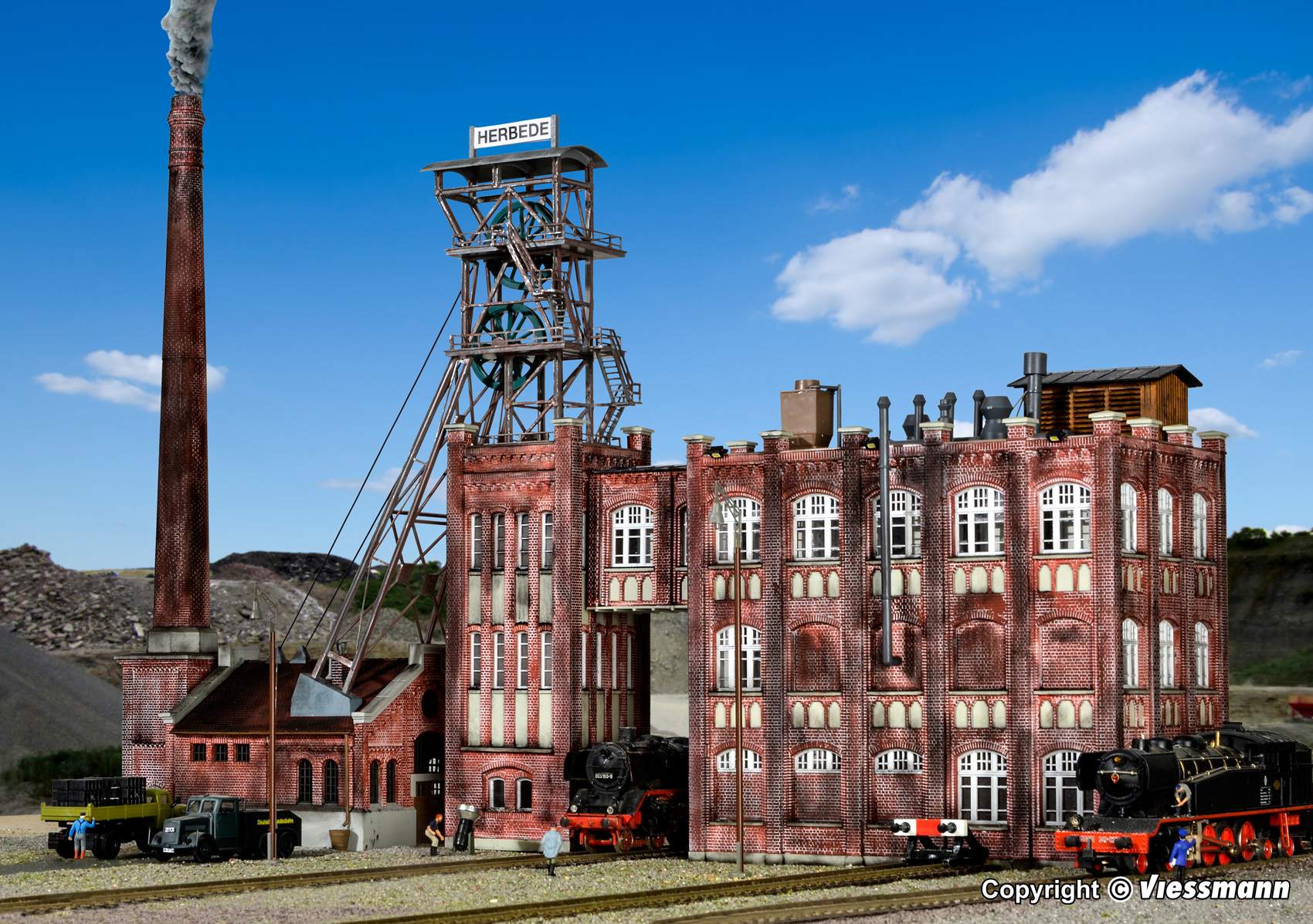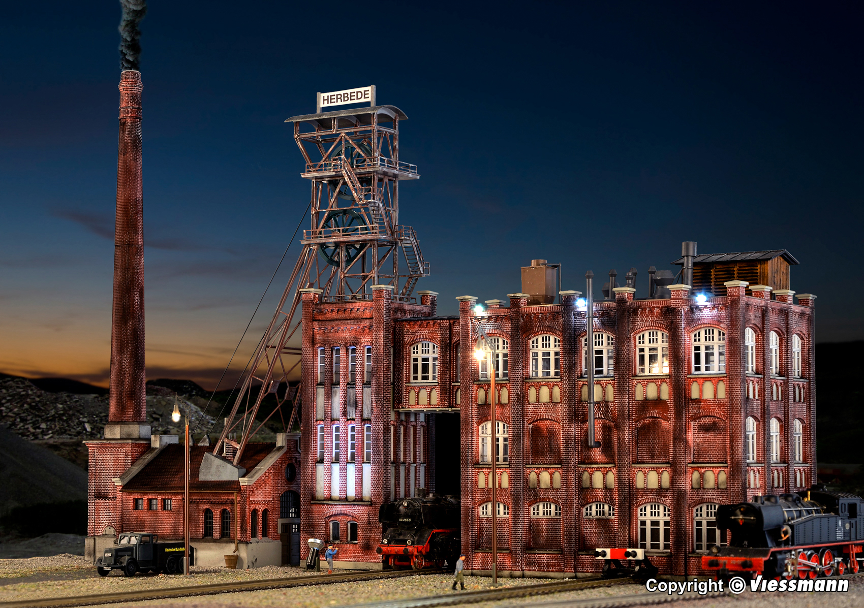 Funktionsbausatz. Die Zeche Herbede hat eine über 120-jährige Geschichte. Das ehemalige Steinkohlebergwerk steht in einem Stadtteil von Witten im Ennepe-Ruhr-Kreis und wurde 1972 stillgelegt. Der Bausatz besteht aus Förderturm, Kesselhaus und Kohlewäschegebäude. Besonders reizvoll: Durch den beiliegenden Antrieb bewegen sich die Seilscheiben im Förderturm absolut originalgetreu. Maße: L 60 x B 16 x H 37 cm. Schwierigkeitsgrad: 3 (Profis).