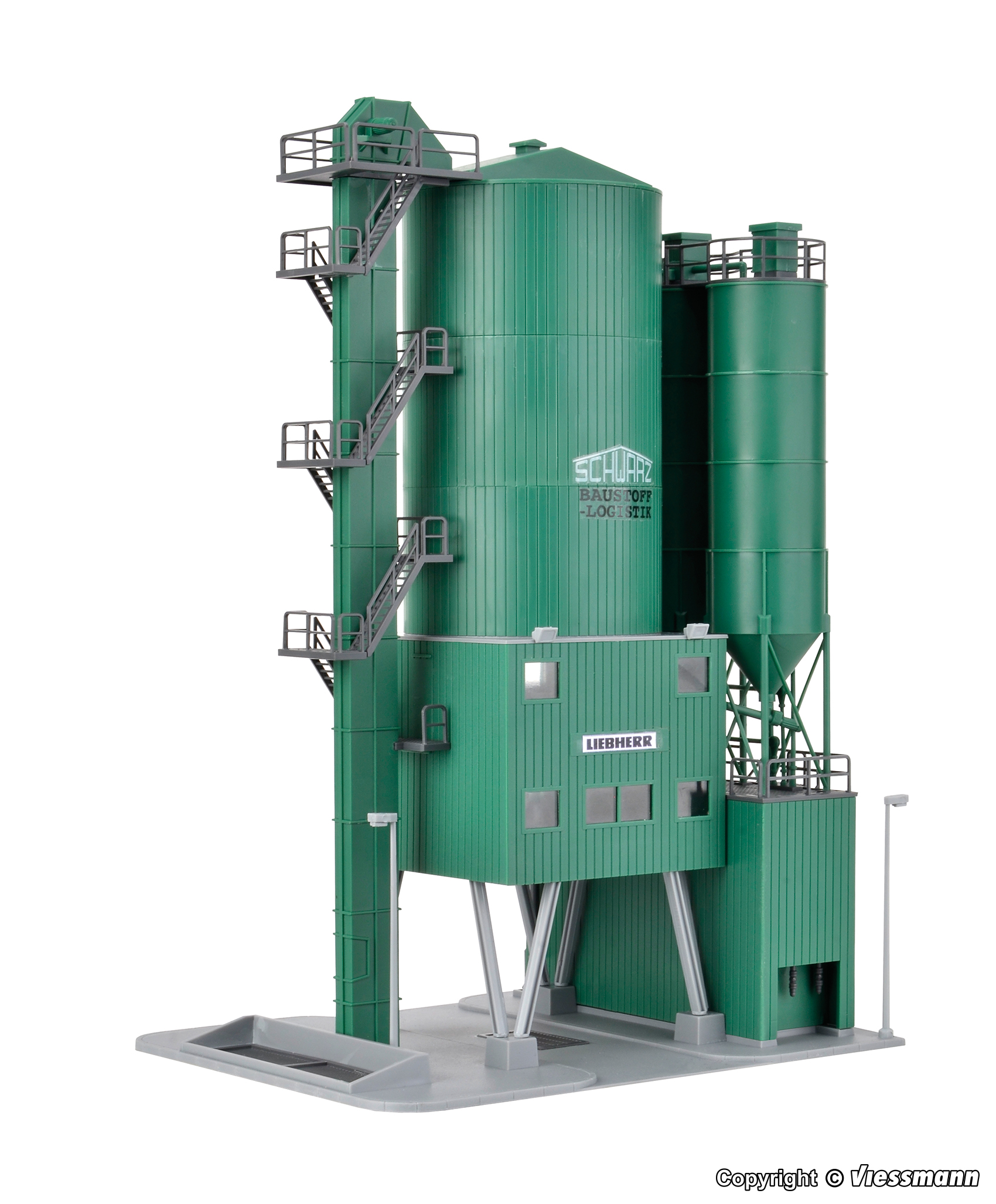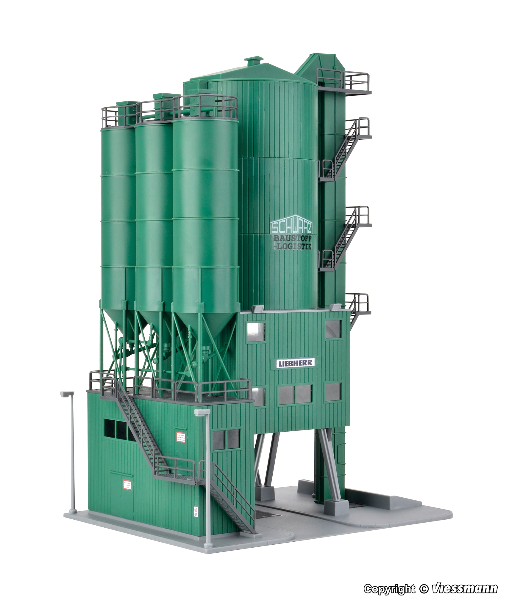 Bausatz. Betonmischtürme von LIEBHERR sind Hochleistungszentralen für eine wirtschaftlich produzierte Qualität von Beton oder Mörtel. Das bewährte Baukastensystem gestattet ganz individuelle Lösungen wenn es darum geht, die Anlage verschiedenen Bedürfnissen anzupassen. Die LIEBHERR-Betonzentralen Betomat werden in der ganzen Welt eingesetzt , wie z. B. in Transportbetonanlagen, Fertigteilwerken, in der Betonproduktion, auf Großbaustellen und auch bei Staudammbauten. Sie sind konzipiert für Ausstoßleistungen von 55 ? 180 m³/h Festbeton. Als Tandemanlage erhöht sich die Leistung auf das Doppelte. Die Firma SchwarzBau ist im kibri Sortiment stark vertreten. Mit dem Betonwerk, der Dieseltankstelle Art. 39932, dem Doppelsilo Art. 39931 und einer großen Auswahl an Baumaschinen in den typischen SchwarzBau Farben können Betriebshof und Baustellen nach Belieben gestaltet werden. Maße: L 18 x B 14 x H 26,5 cm. Durchfahrtshöhe: 5,0 cm. Durchfahrtsbreite: 4,0 cm. Mit Stecksystem. Schwierigkeitsgrad: 2 (Fortgeschrittene).