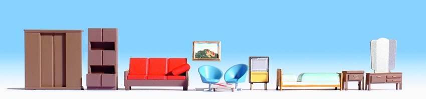 Inhalt: Wohnzimmer-Schrank, Sofa, Fernseher, Nierentisch, 2 Sessel, Gemälde, Schlafzimmerschrank, Bett, Spiegelkommode, Nachttisch