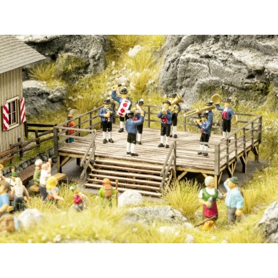 Festbühne mit micro-sound Blaskapelle. Hier wird getanzt, gesungen und gefeiert: Die kleine Holzbühne steht auf jedem Dorf- oder Stadtfest im Mittelpunkt! Die Kapelle spielt den Radetzky-Marsch, der über einen kleinen Lautsprecher, der im Modell verbaut ist, wiedergegeben wird. Das Musikstück ist auf dem Chip der Elektronik gespeichert. Die komplette Elektronik inklusive Lautsprecher ist anschlussbereit aufgebaut. Anschluss erfolgt an einen üblichen 16-V-Modellbahntrafo. Geeignet für Gleich- und Wechselstromanschluss. Inklusive Figuren-Set Musikkapelle (Art.-Nr. 15580). Maße: Länge: 90 mm, Breite: 83 mm, Höhe: 26 mm