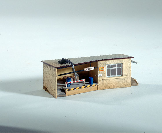 Das Auslieferungsbüro bietet mit seinem originell gestalteten Blechdach eine interessante Überdachung für das vorhandene Abfüllager. Durch einen Treppenaufstieg gelangt man in das kleine Büro. Im Lager werden Fässer befüllt und Ölfässer gelagert. Behälter liegen dem teilweise gealterten Bausatz bei.