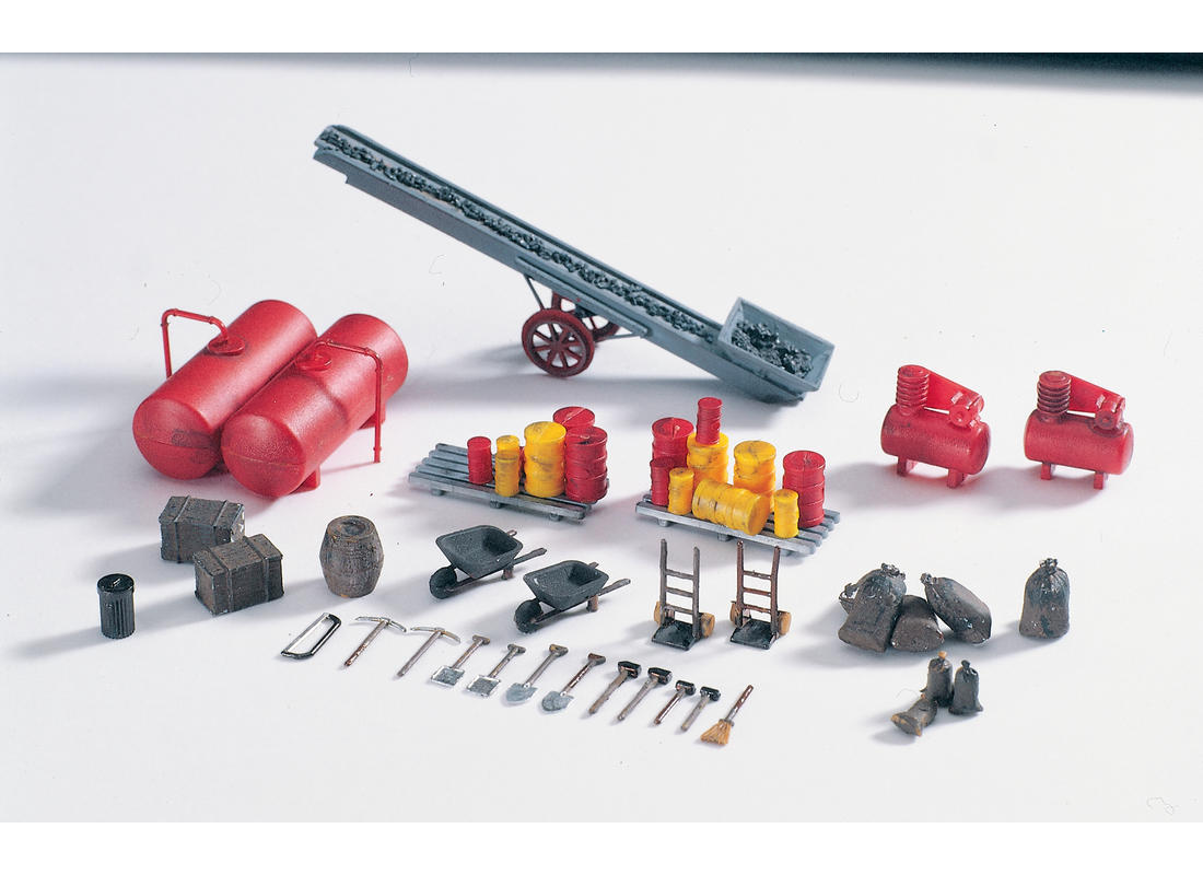 Dieser Bausatz enthält das typische Zubehör wie Förderband, Fässer, Sackkarren und Schubkarre. Dieser Zurüstsatz läßt keine Wünsche offen.