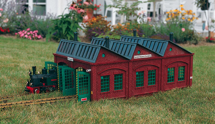 Zweiständiger Lokschuppen mit Sheddach und angebauter Werkstätte. Die beweglichen Tore können mittels der PIKO-Torschließ-Automatik, 62002, durch die ein- und ausfahrende Lok geschlossen bzw. wieder geöffnet werden. Im Schuppen haben Loks bis zu einer Gesamtlänge von 65 cm Platz. Der gealterte und wetterfeste Schuppen kann mit weiteren Bausätzen beliebig in Länge und Breite vergrößert werden.