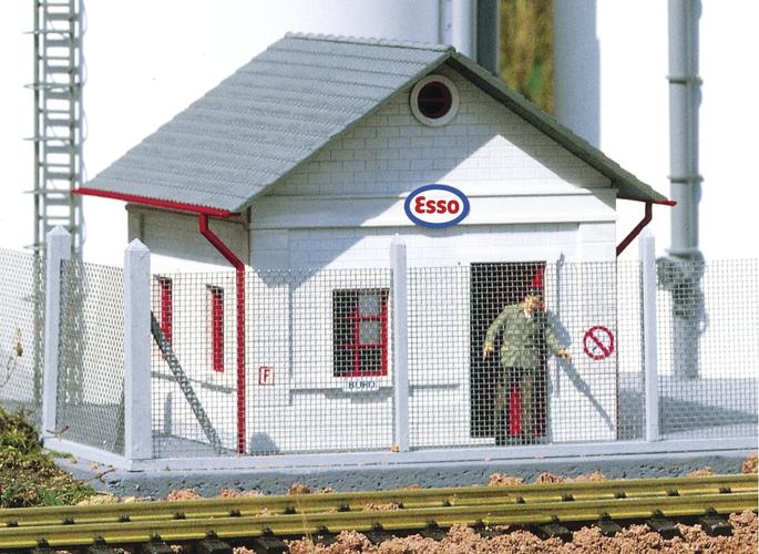 Das kleine Verkaufsbüro ist für die Erledigung des Papierkrams auf dem Gelände des Tanklagers aufgestellt worden. Eine bewegliche Tür ermöglicht den Arbeitern den Zugang.
