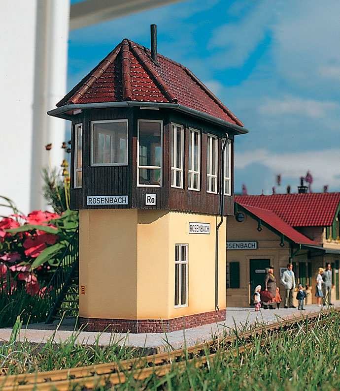 Der rundum verglaste Stellwerksraum beherbergt die Hebelbänke für die Weichen- und Signalbedienung. Überaus typisch: die filigran wirkende Außentreppe samt Geländer. Als Ergänzung empfehlen wir die Bodenplatte # 62005 (1 x).